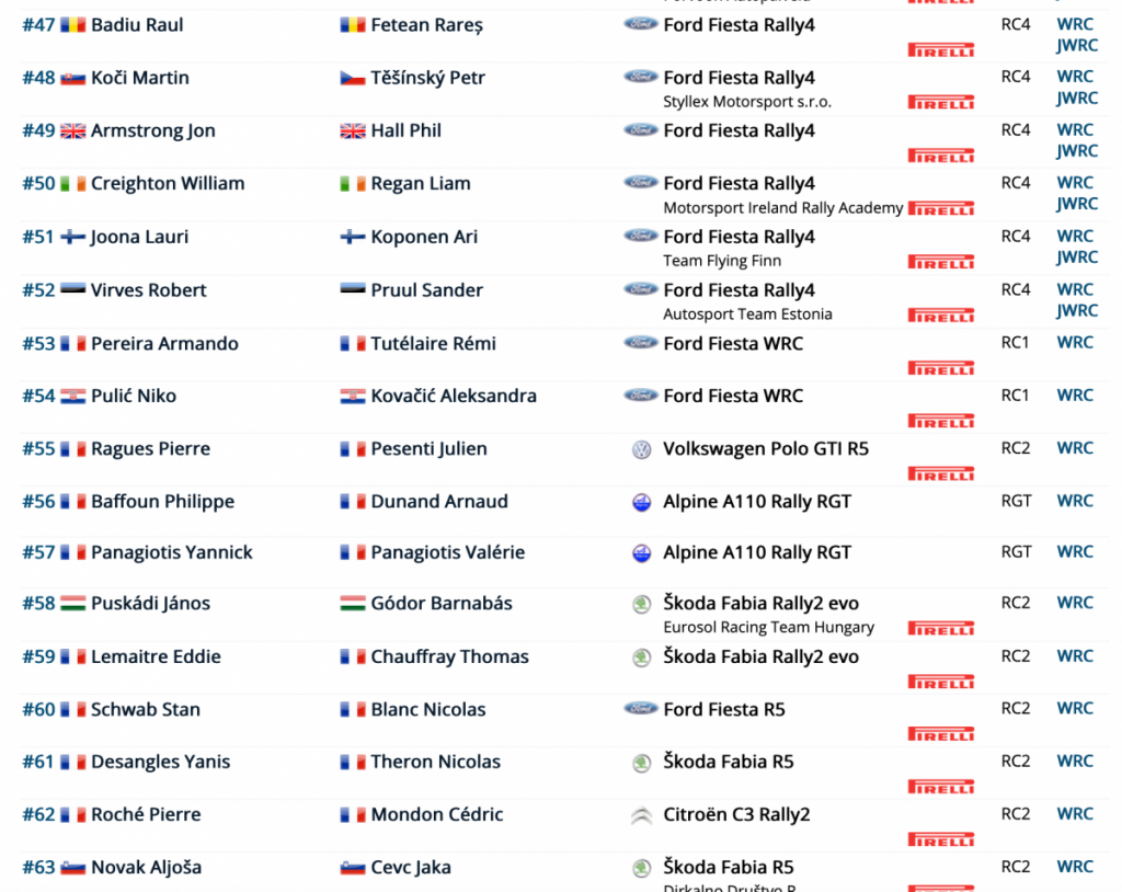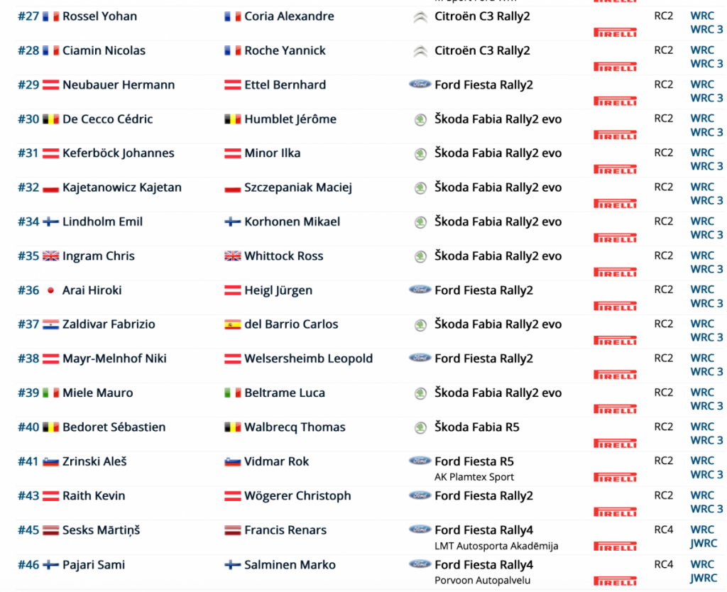 Entre los WRC2 estarán Andreas Mikkelsen (Skoda Fabia), Teemu Suninen (Ford Fiesta), Mads Ostberg (Citroën C3), Nikolay Gryazin (Volkswagen), Marquito Bulacia (Skoda) y Tom Kristensson (Ford), entre otros.