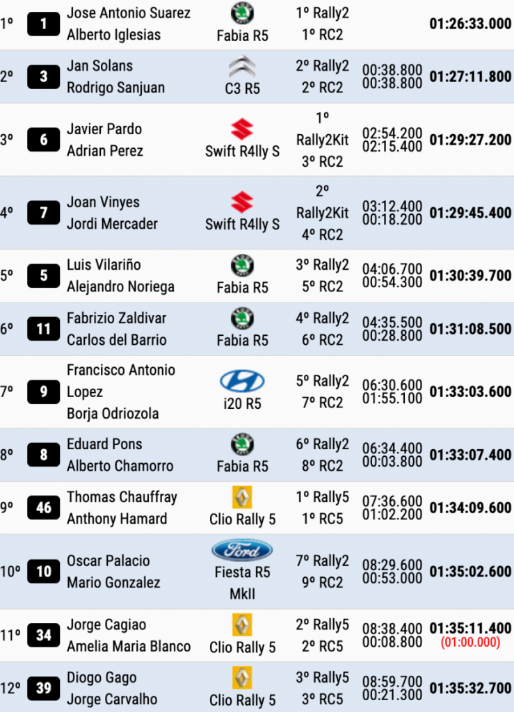 Gran carrera de Thomas Chauffray y Anthony Hamard (Renault Clio Rally 5) para terminar novenos y como primeros de los Clio, cerrando las diez primeras posiciones Oscar Palacio y Mario González (Ford Fiesta R5), seguido de Jorge Cagiao y Amelia Maria Blanco (Renault Clio Rally 5), a los que una penalización de un minuto les dejó fuera del top 10.