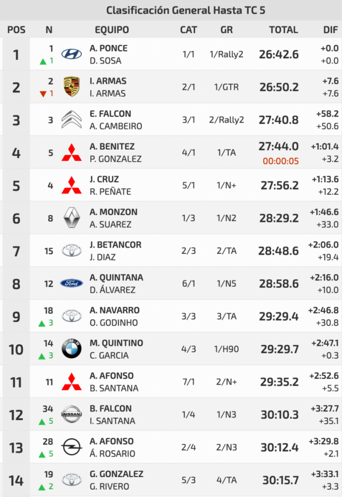 Los del i20 R5 marcaban un 6:17.0, lo que les valió para superar en 11.1 a Iván Armas e Iván Armas Jr (Porsche 911 GT3) y ponerse líderes con una renta de 7.6 en la segunda cita del Campeonato de Las Palmas de Rallys.