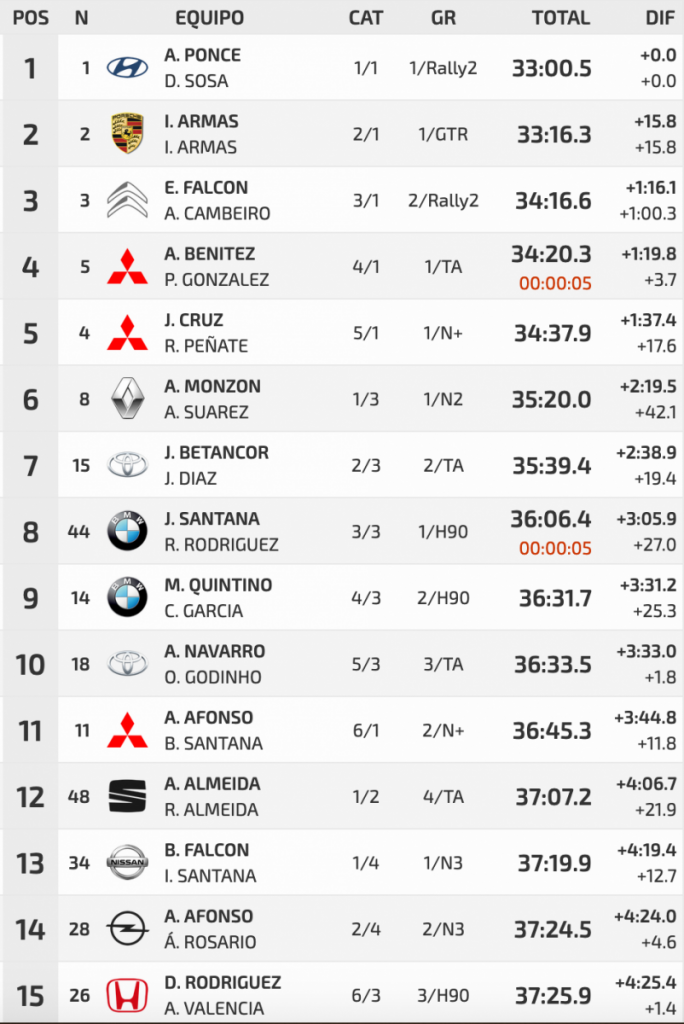 A pesar de ser los más rápidos de los dos primeros tramos, con una renta de 19.2 a su favor tras un trompo de sus perseguidores, Iván Armas e Iván Armas Jr (Porsche 911 GT3), en la tercer crono se daba un giro tras los problemas de Ponce y Sosa y pasaban los Armas a liderar la cita con 3.5, pero en las siguientes especial los del Hyundai ponían toda la carne en el asador para llevarse el segundo triunfo consecutivo del Provincial al ser suspendido el último tramo y ser así el piloto que más triunfos tiene del Telde tras desempatar con Medardo Pérez, con siete victorias.