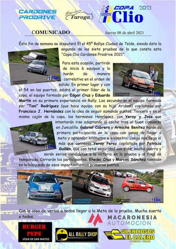 El Rally Ciudad de Telde fue testigo de la segunda cita de la Copa Clio Cardone Prodrive, donde Yeray Alberto Pérez y Patricia Guillén (Renault Clio Williams) lograron una contundente victoria al superar en 1:10.9 a Gabriel Cabrera y Armiche Benítez (Renault Clio Sport 2.0), segundos.