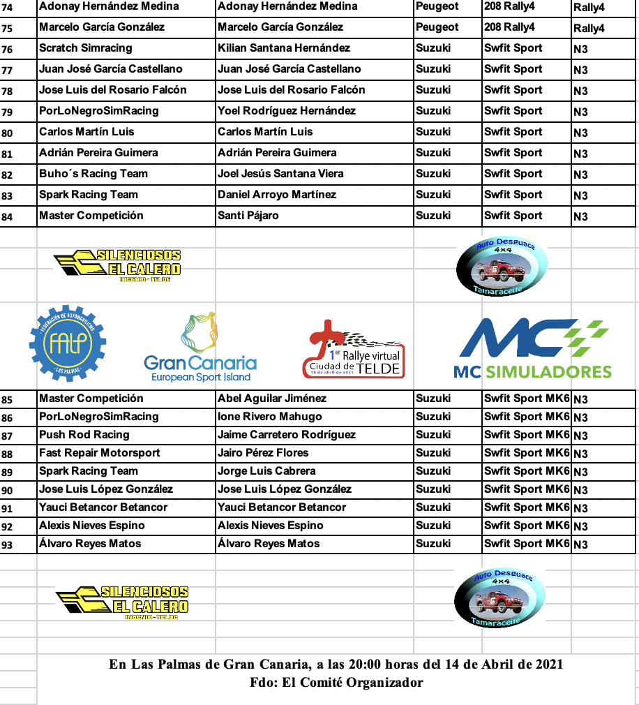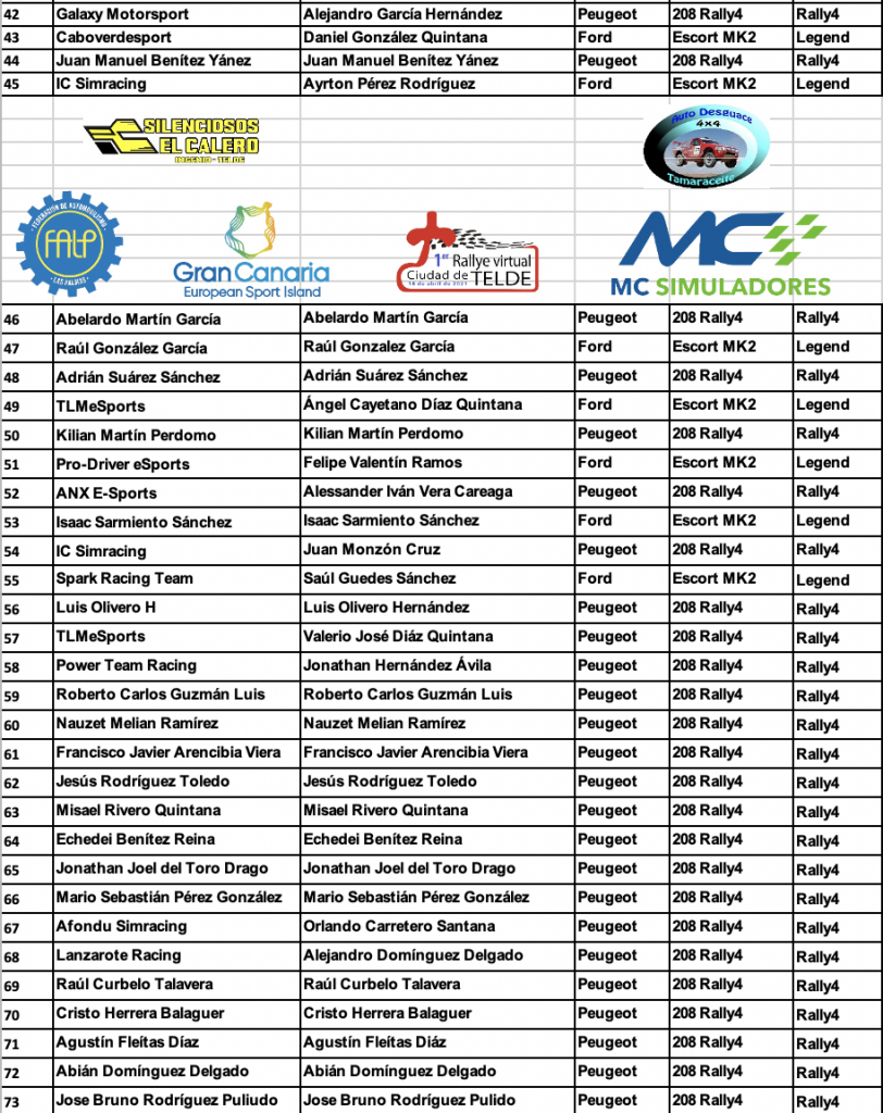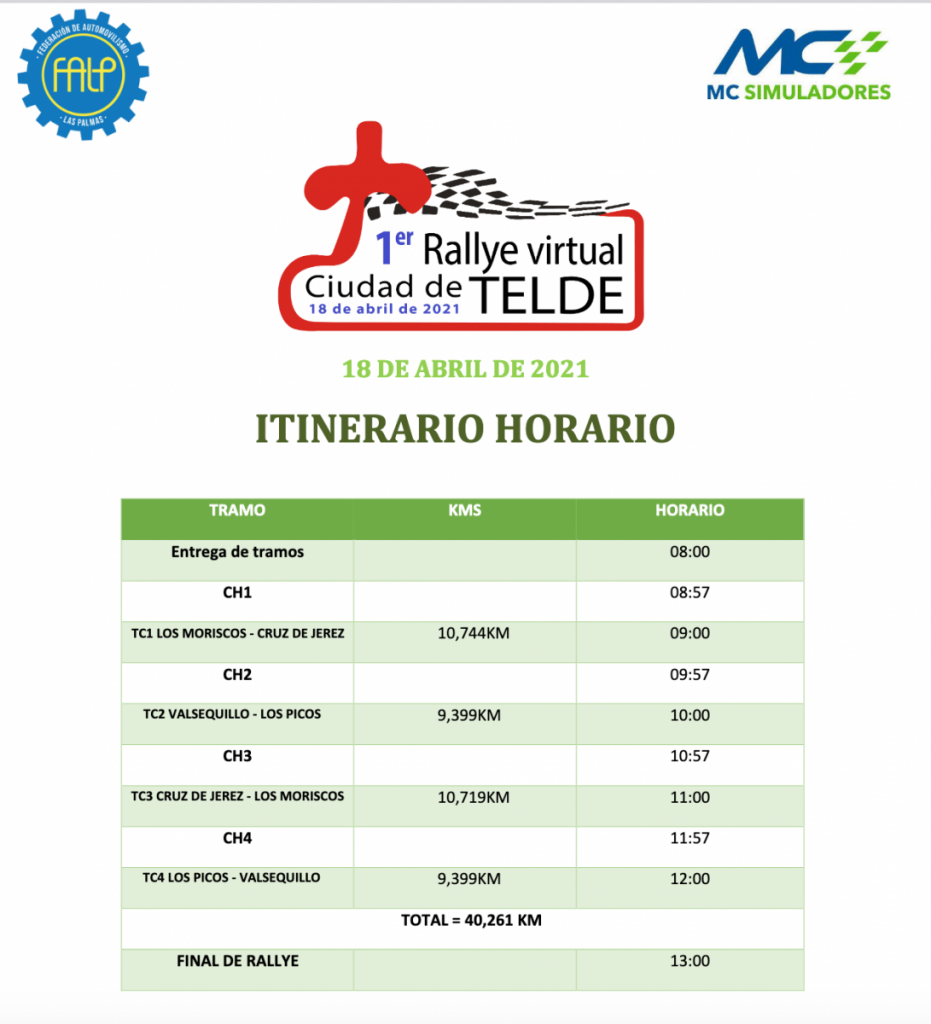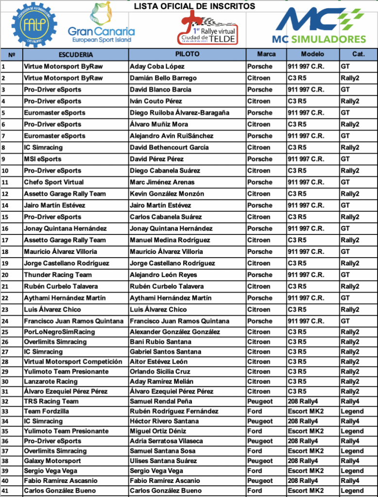 Este domingo 18 de abril a las 9 de la mañana arranca el I Rally Virtual Ciudad de Telde. De los más de 100 inscritos al Campeonato Provincial de Las Palmas de Rallys Virtuales, se ha cerrado esta primera cita con 92 pilotos, entre los cuales destaca lo mejorcito del panorama Simracer nacional. Encabezados por la legión canaria, pero son bastantes los pilotos del territorio peninsular que se han unido también a este certamen promovido por la FALP, destacando entre ellos pilotos de rallys reales como Rubén Curbelo, Álvaro Muñiz, Diego Cabanela, Adriá Serratosa, Sergio Vega y Diego Ruiloba. También los copilotos han aprovechado para cambiar de baquet en el mundo virtual y tendremos a los conocidos David Bethencourt, Juan Monzón o Jonathan Hernández entre los participantes.