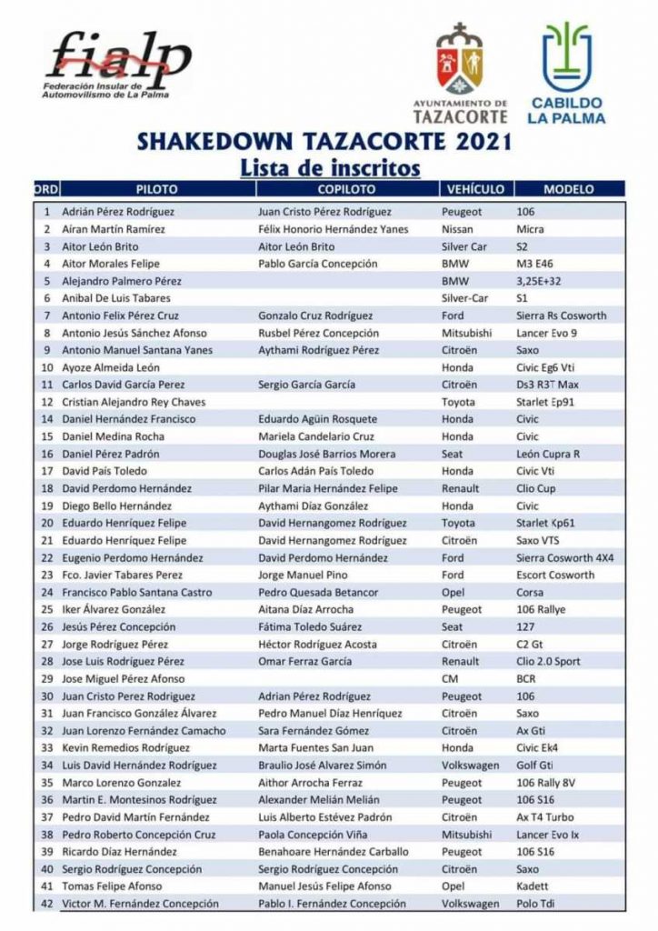 Publicamos la lista de Inscritos del Shakedown Tazacorte 2021, primer evento que se celebre en la isla de La Palma después de un año de parón competitivo.