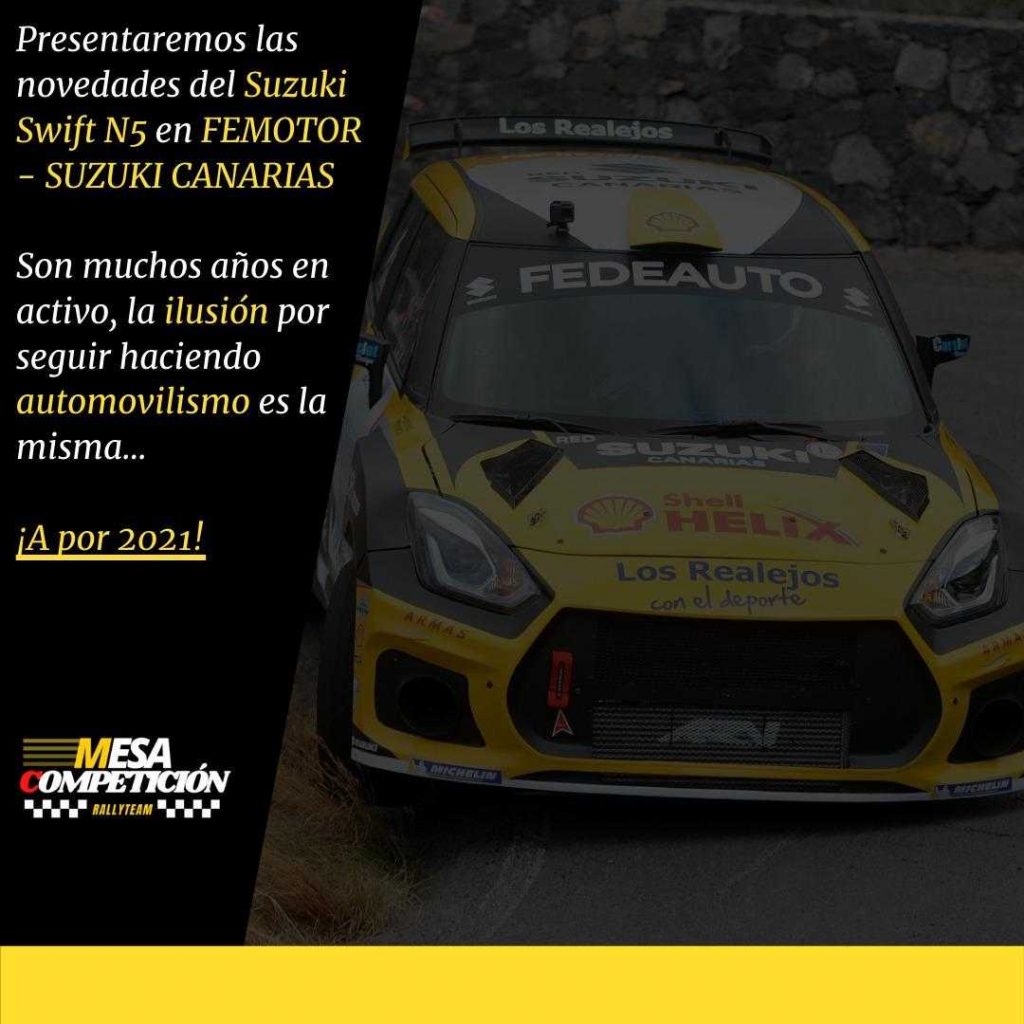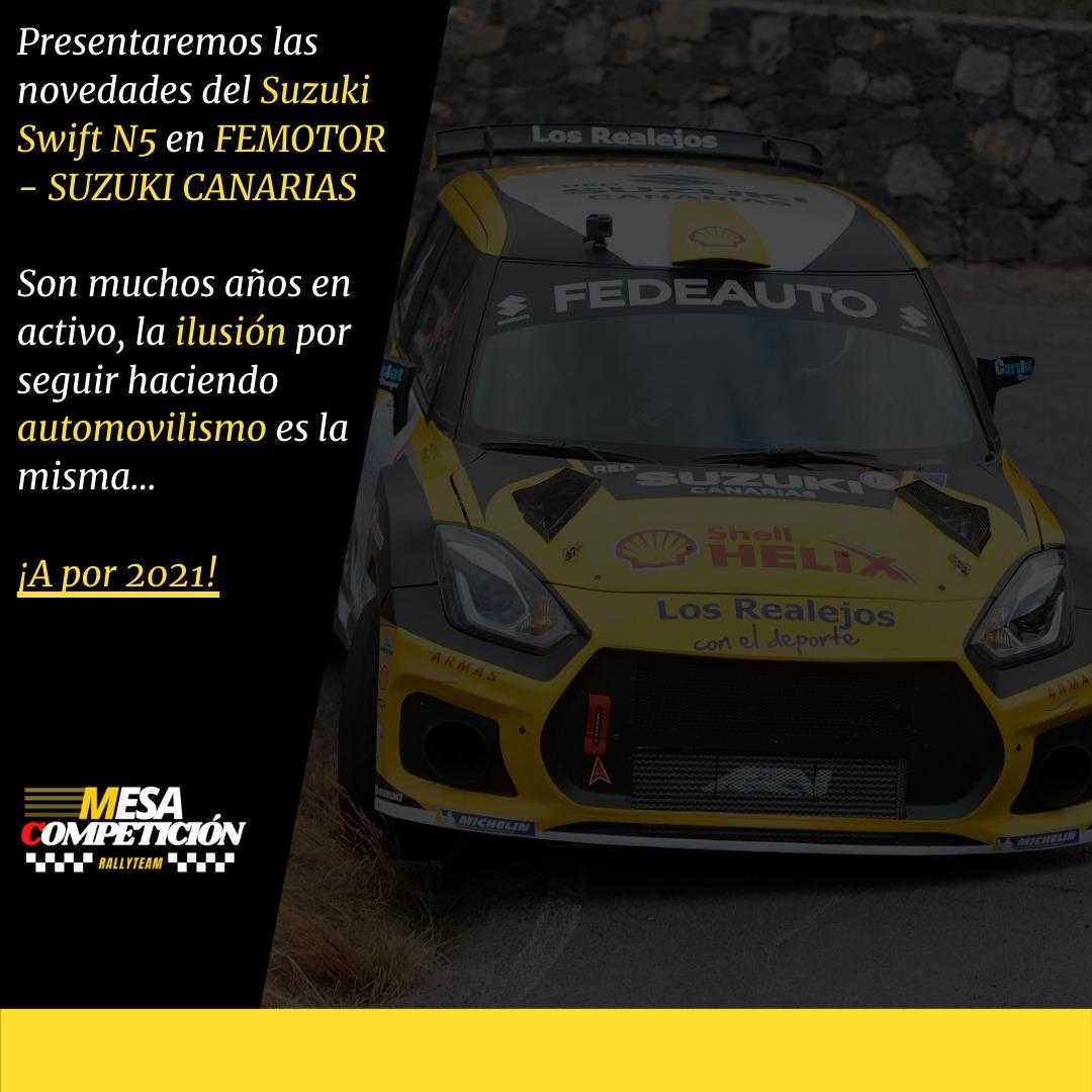 Será en las instalaciones de Suzuki Canarias – FEMOTOR en Tenerife donde el renovado Suzuki Swift N5 que pilotará Manolo Mesa y que este año contará a la derecha con Víctor Pérez y Ariday Bonilla, lucirá los cambios con los que afrontará la temporada 2021.