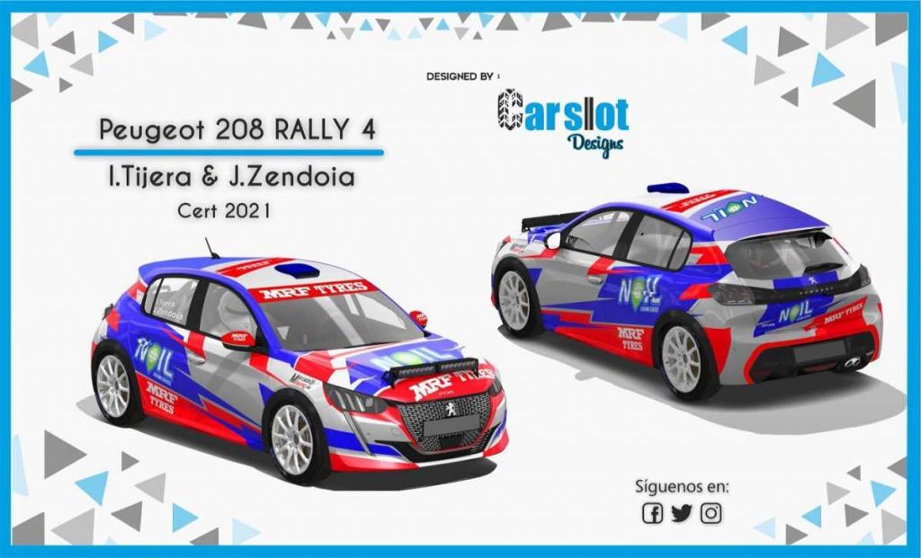 Al igual que en 2020, la marca de neumáticos MRF Tyres y el portal de anuncios web Mercadoracing serán los mayores apoyos de la temporada para el piloto vasco. Además, este año se ha unido al programa Noil Station Service, cadena de gasolineras del norte de nuestro país. Con todo ello, el 208 Rally4 lucirá de la siguiente manera para 2021: