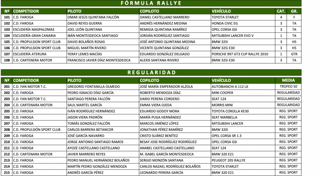 Por error en la revisión y punteo de las inscripciones recibidas, “nos hemos visto obligados a corregir la lista incluyendo a un participante en Fórmula Rallye y que le hemos asignado el Nº 108 a Francisco Javier Díaz y Alexis Santana (BMW 325 i TA3)”, afirmaron desde la escudería Aterura.