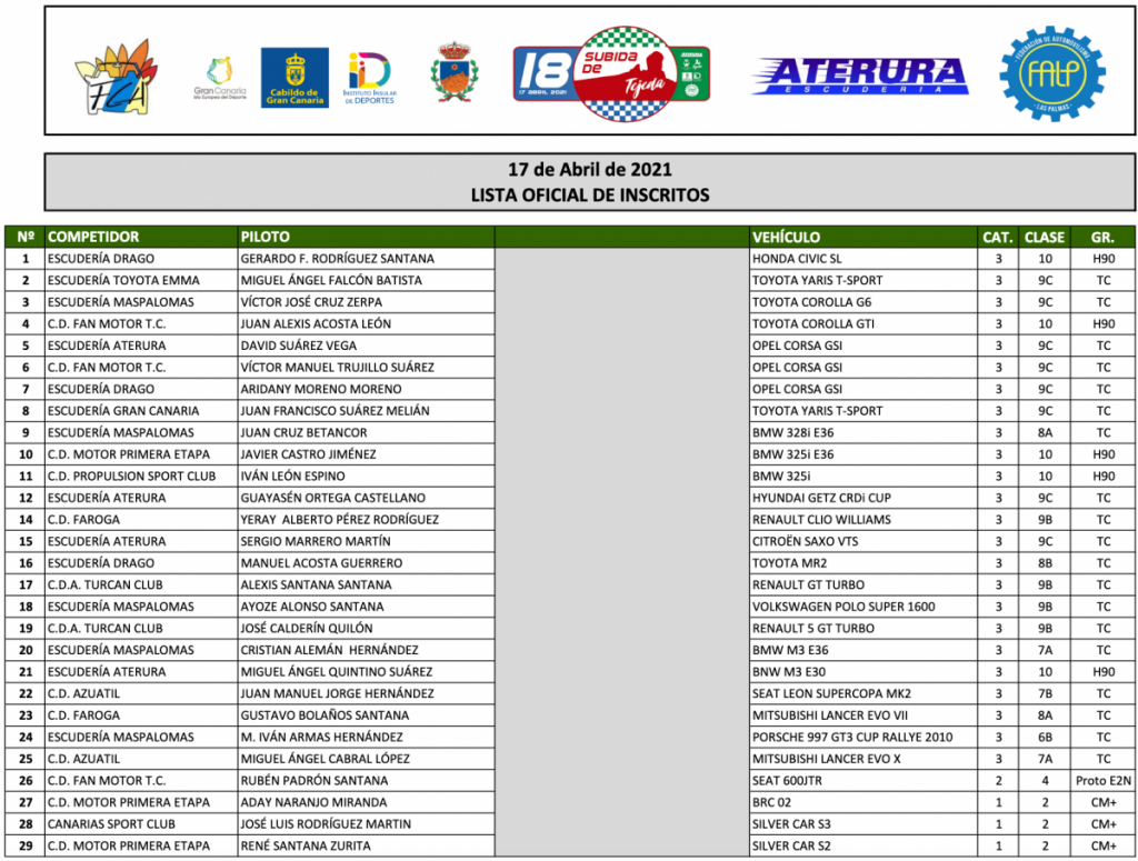 Por error en la revisión y punteo de las inscripciones recibidas, “nos hemos visto obligados a corregir la lista incluyendo a un participante en Fórmula Rallye y que le hemos asignado el Nº 108 a Francisco Javier Díaz y Alexis Santana (BMW 325 i TA3)”, afirmaron desde la escudería Aterura.