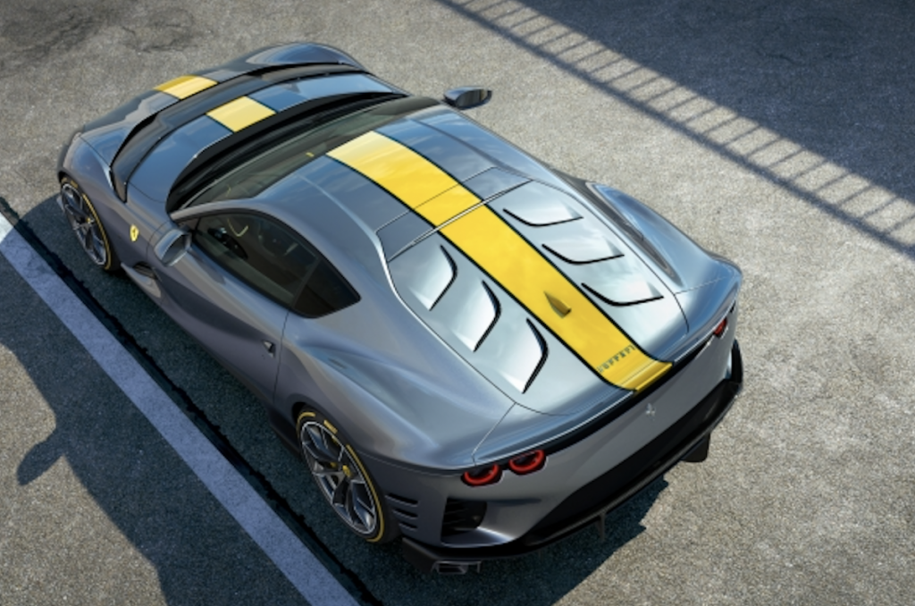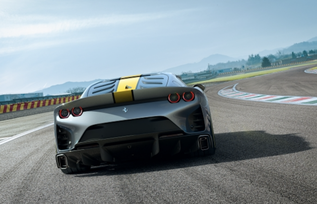 Junto con la hoja de fibra de carbono que atraviesa el capó, este diseño cambia la percepción general de los volúmenes del automóvil. El capó parece más corto, acentuando su anchura, mientras que la parte trasera muestra un efecto fastback más pronunciado, lo que le otorga un aspecto más compacto y de competición, pese a compartir silueta, proporciones y equilibrio formal con el 812 Superfast. Incluso el spoiler trasero ahora adquiere un aspecto más imponente. Es ahora más alto, pero su diseño hace que el espejo de popa parezca muy ancho, casi horizontal.