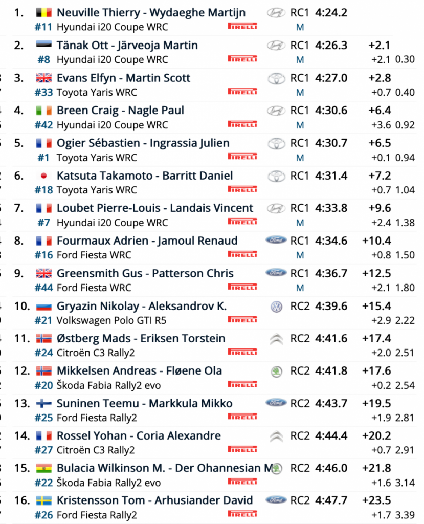 Los belgas Thierry Neuville y Martijn Wydaeghe (Hyundai i20 Coupe WRC) han sido los más rápidos de la especial inaugural Rude – Plešivica (6.94 km) con 2.1 sobre sus compañeros de equipo, los estonios Ott Tänak y Martin Järveoja (Hyundai i20 Coupe WRC).