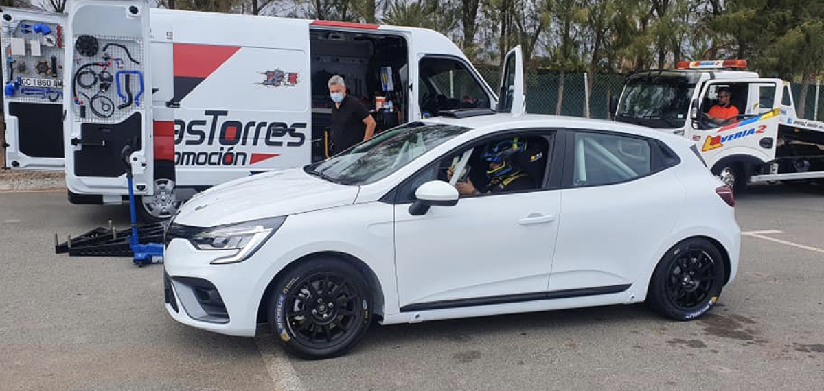 Primeros kilómetros de los grancanarios Sebastián y Adrián Gil en el circuito de Maspalomas con su nuevo Renault Clio Rally5, unidad que sustituye al Renault Twingo R2 que venían utilizando hasta la fecha.