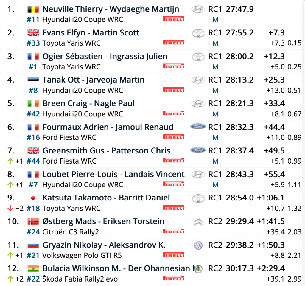 Lejos de los anteriores se encuentran los estonios Ott Tänak y Martin Järveoja (Hyundai i20 Coupe WRC), a 25.3 de la cabeza y a 13.0 del último escalón del podio.