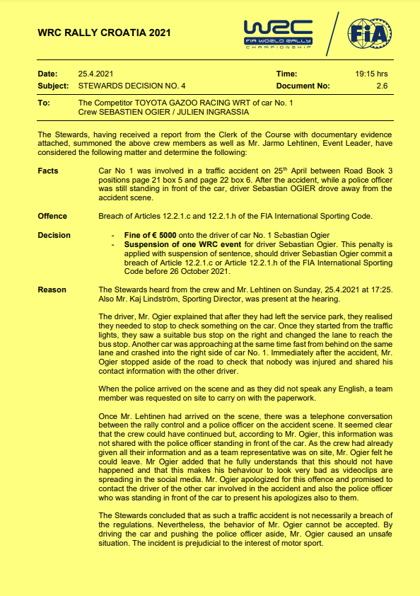 «El Sr. Ogier se disculpó por la ofensa y prometió comunicarse con el conductor del otro automóvil involucrado en el accidente, así como con el oficial de policía parado frente al automóvil para disculparse con ellos también. Los comisionados concluyeron que, como tal, un accidente de tráfico no constituye necesariamente una violación de las reglas. Sin emabargo. No se puede aceptar el comportamiento del Sr. Ogier. Conduciendo el coche y haciendo a un lado al policía. El Sr. Ogier provocó una situación peligrosa. El incidente va en detrimento de los intereses del automovilismo».