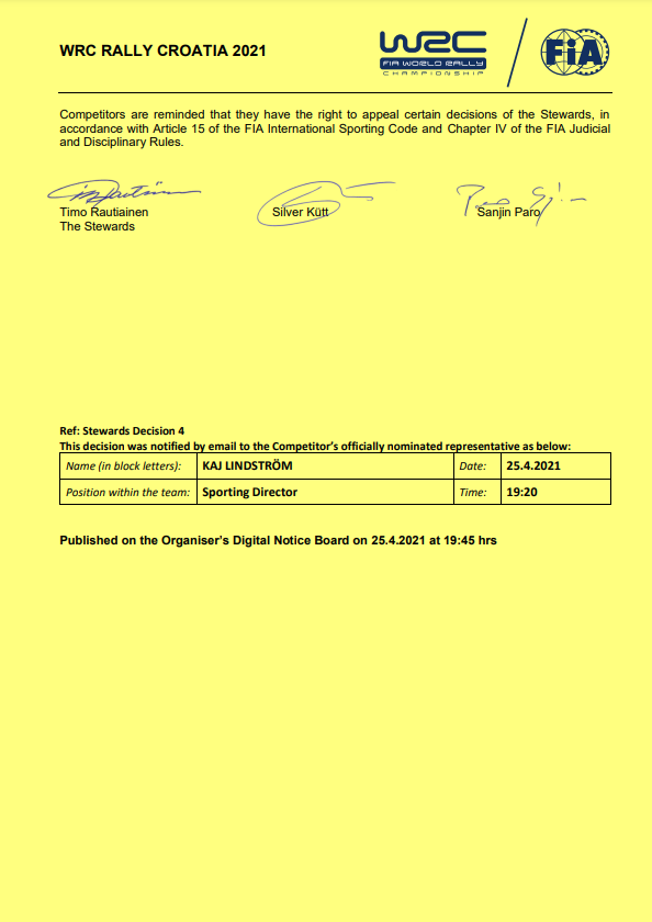 Finalmente, en un tercer documento oficial relativo a este incidente con la policía, el equipo Toyota Gazoo Racing recibió una reprimenda, quedando prohibida la presencia de Jarmo Lehtinen, director deportivo del equipo en el lugar del incidente.