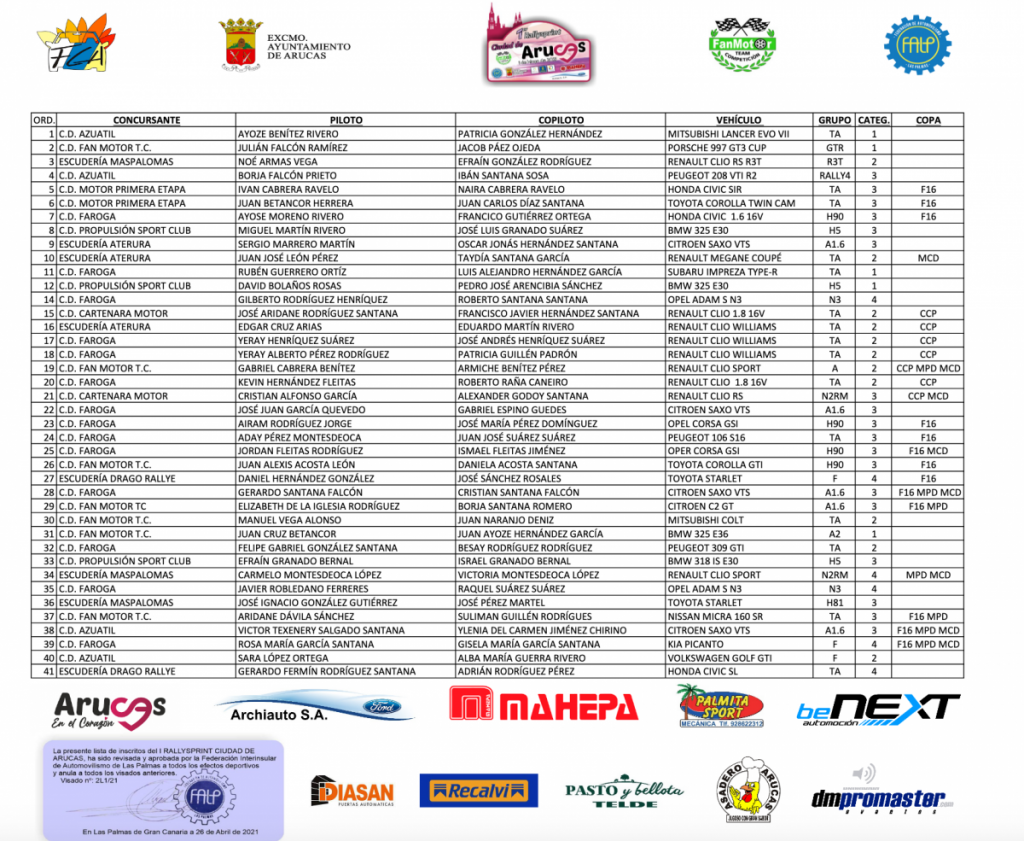 Un total de 40 equipos se han inscrito para el I Rallysprint Ciudad de Arucas, una prueba novedad esta temporada 2021 en el automovilismo grancanario y organizada por el CD. Fan Motor. Será valedera para el Campeonato Provincial de la especialidad y otros certámenes como la Copa Faroga 1.6-Pastelería La Madera, el Trofeo Mejor Debutante y la Copa Clio Cardones-Prodrive.