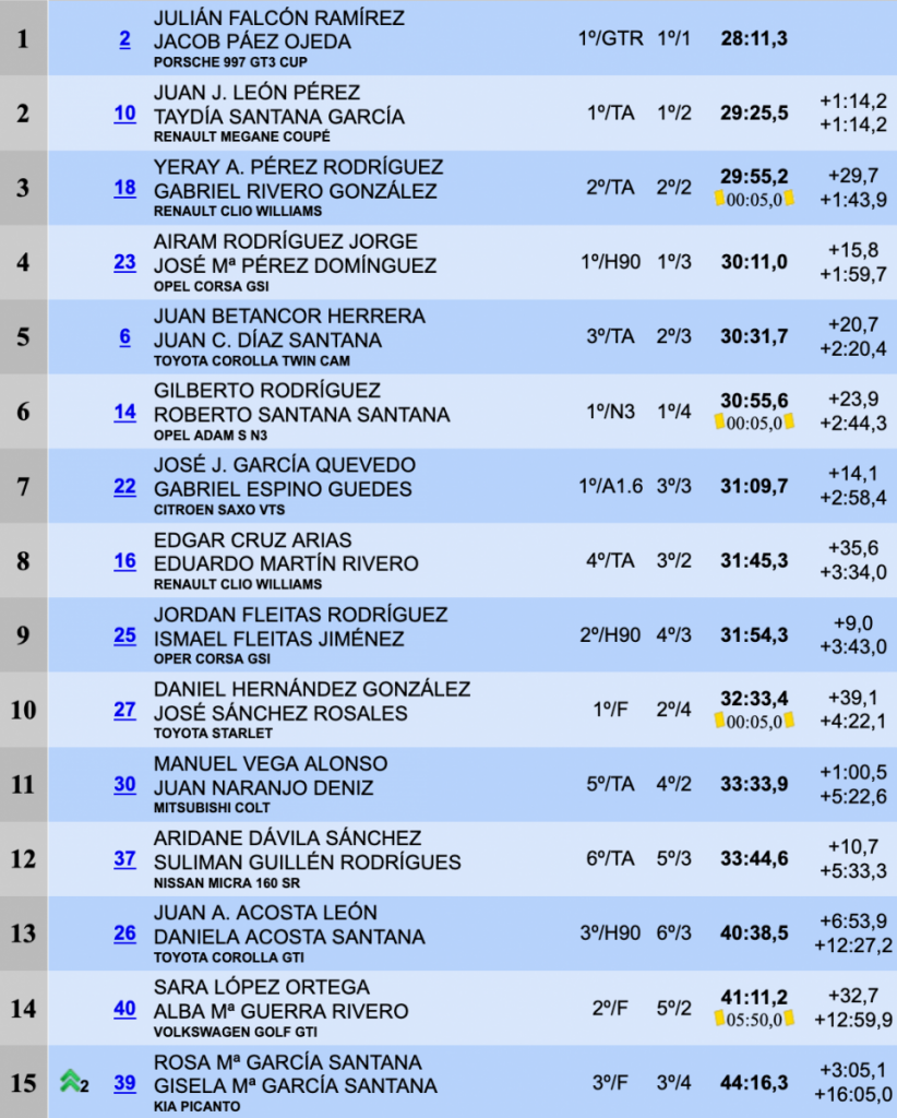 El cuarto puesto de la general y primero de la Copa Faroga se lo llevaron Airam Rodríguez-José Pérez con el Opel Corsa GSi, muy regulares y rápidos con este veterano coche, rebasando a otro de los protagonistas de la jornada, Juan Betancort-Juan Carlos Díaz, quintos con el Toyota Corolla después de rodar en zona de podio, hasta que un error de pilotaje les hizo perder muchos segundos y bajaban tres puestos en la general. Gilberto Rodríguez-Roberto Santana subieron hasta la sexta plaza con el Opel Adam N3.