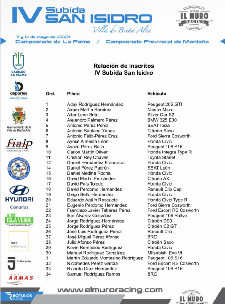 Publicamos la relación de inscritos del IV Subida San Isidro (La Palma). El gran favorito al triunfo será Jorge Rodríguez con su Citroën DS3 R5, destacando el regreso del veterano Nicomedes Pérez con su Ford Escort RS Cosworth, misma unidad con la que competirá Francisco Javier Tabares.