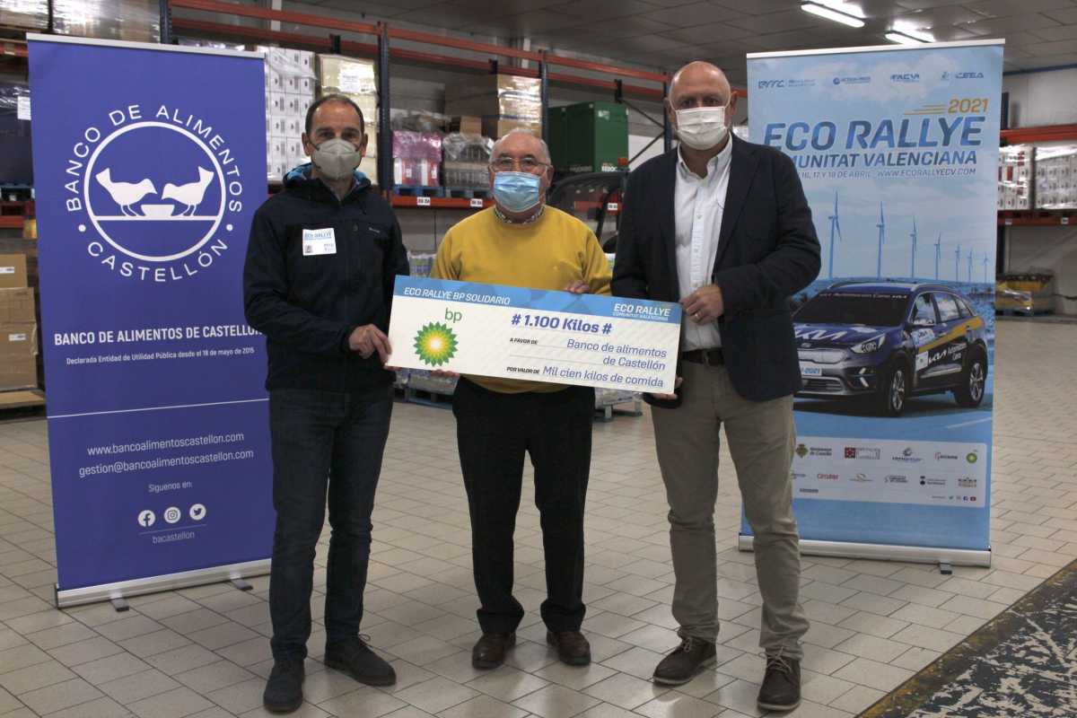 La donación, que ha tenido lugar en las instalaciones del Banco de Alimentos de Castellón, ha contado con la presencia de su presidente, Santiago Miralles; el responsable de comunicación de BP España, Juan Carlos Navarro; y el presidente del Comité Organizador del Eco Rallye de la Comunitat Valenciana, Fernando Lobón.