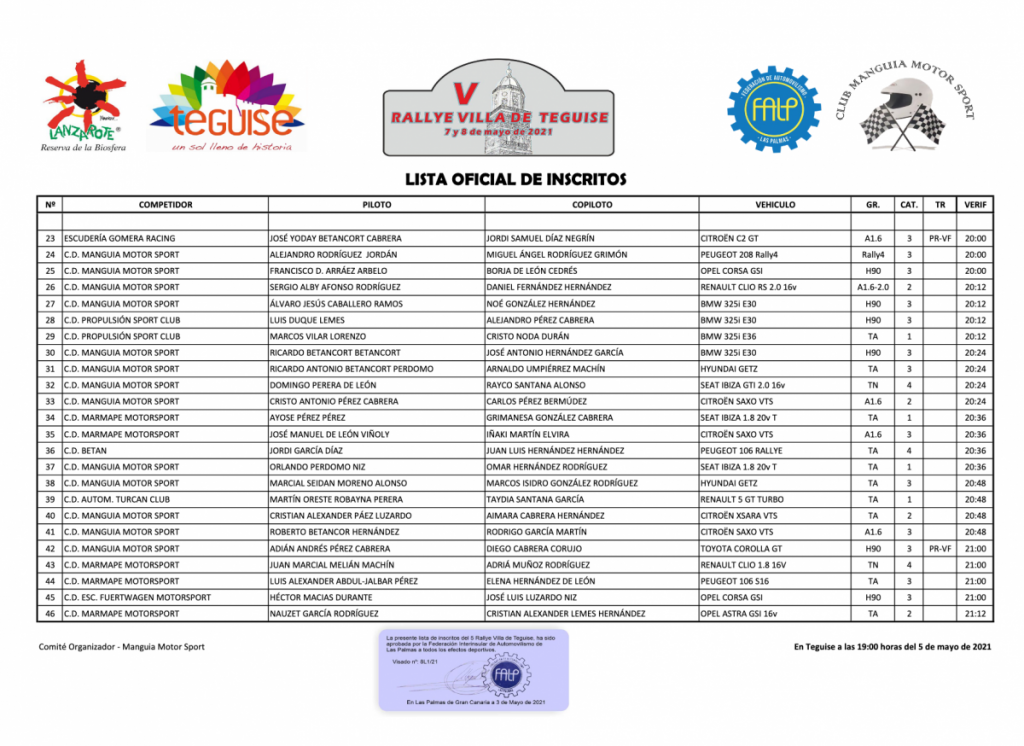 Publicamos la lista oficial de inscritos del V Rally Villa de Teguise, cita del Provincial de Las Palmas y del Insular de Lanzarote.