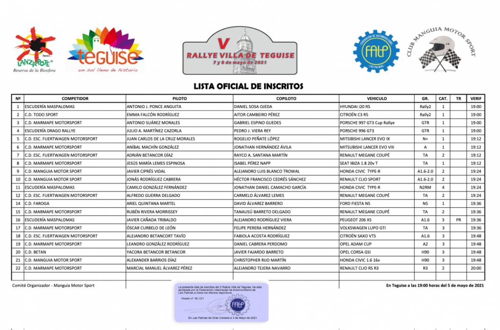 Publicamos la lista oficial de inscritos del V Rally Villa de Teguise, cita del Provincial de Las Palmas y del Insular de Lanzarote.