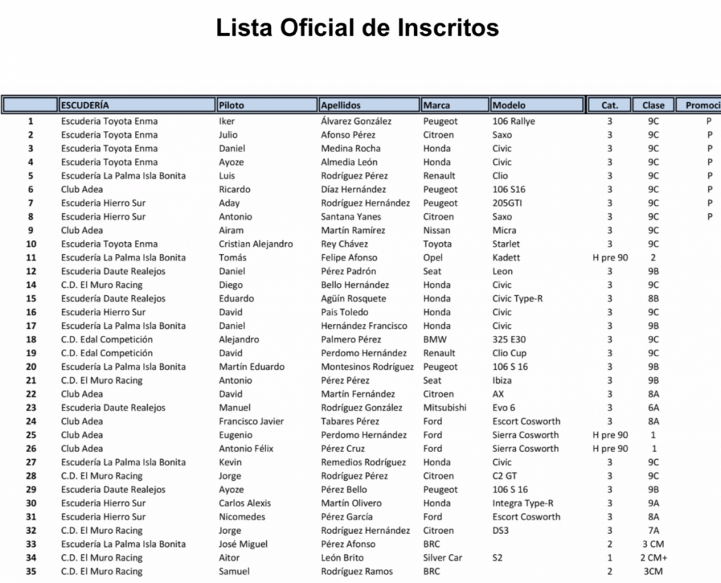 El Muro Racing, entidad que organiza la IV Subida San Isidro, publica la lista oficial de inscritos de una cita que será la primera en el Campeonato de Tenerife de Montaña. Al mismo tiempo, inaugurará el Insular de La Palma y el nuevo certamen de montaña de la Isla Bonita. Cabe indicar que esta prueba que tiene lugar en la Villa de Breña Alta será la primera sobre asfalto en la isla desde que se declarase, a comienzos de 2020, la pandemia derivada del Covid-19.