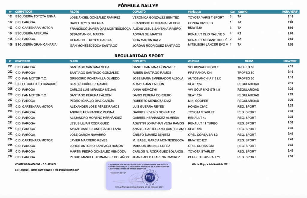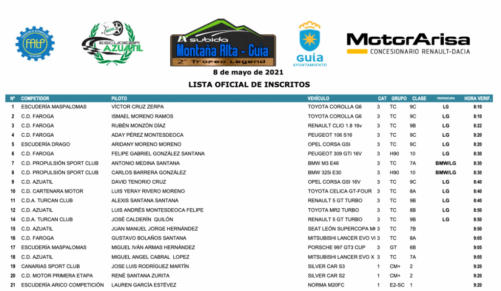 La Subida de Montaña Alta-Guía ya tiene lista oficial de inscritos y ya solamente queda disfrutar del desarrollo de la prueba organizada por el CD. Azuatil y promovida por el Ayuntamiento de Guía, que se disputa este sábado 8 de mayo en la carretera de Montaña Alta, como tercera cita del Campeonato Provincial de Las Palmas. La lista oficial de inscritos en la modalidad reina de velocidad la forman 20 pilotos, de los cuales los 14 primeros entran dentro del II Trofeo Legend. En Fórmula Rallye se han reunido seis equipos y amplia participación en Regularidad Sport para vehículos clásicos, con 17 participantes que en su mayoría han elegido la media alta.