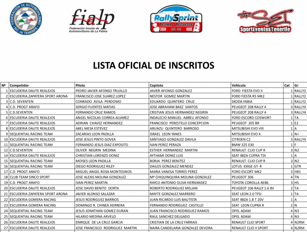Sport Eventos Tenerife ultima los detalles para celebrar el I Rallysprint Tejina- Tegueste este fin de semana 7 y 8 de mayo. Así, ya se ha publicado la lista oficial de equipos inscritos como estaba previsto en el programa horario de la prueba, con casi medio centenar equipos. De esta forma, 36 equipos partirán en velocidad, y 11 harán lo propio en regularidad.