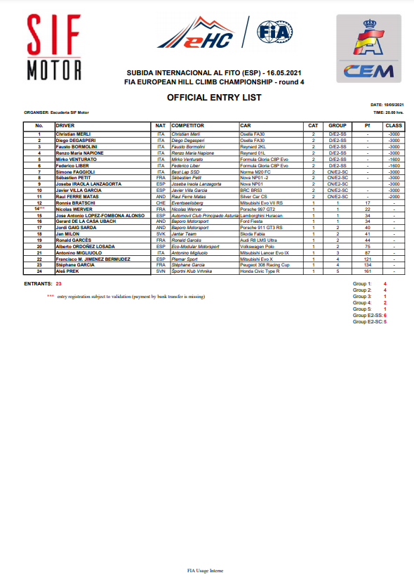 En el Fito, el CEM estrena nueva denominación de sus categorías para una mejor armonización de la nomenclatura con la vigente en el certamen FIA. De ese modo, la categoría en la que compiten los vehículos ‘carrozados’ pasa a ser la 1 (con sus participantes agrupados en clases según el ‘Performance Factor’), la 2 engloba ahora a las ‘barquetas’ y sport-prototipos biplazas de los grupos E2-SC, CN y CM+ mientras que la 3 queda reservada a los CM-Promoción, ‘siluetas’ del grupo E2-SH y prototipos de los grupos E1 y E2 nacional.