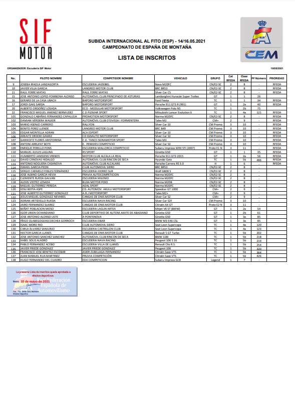 Con un total de ciento dieciséis inscritos, repartidos entre las diferentes categorías de los campeonatos de Europa, España y Asturias de montaña, la edición número 49 de la Subida Internacional al Fito se presenta llena de alicientes. En el certamen europeo han anunciado su presencia veintitrés pilotos, encabezados por los dos grandes favoritos para la victoria absoluta, los italianos Christian Merli (Osella) y Simone Faggioli (Norma), campeones de Europa ‘ex-aqueo’ en la categoría 2 en el 2019. Junto a ellos competirán en la máxima categoría del certamen continental tres de los principales aspirantes al triunfo en la prueba del Campeonato de España, Javi Villa (BRC), Joseba Iraola (Norma) y Raúl Ferré (Silver Car).