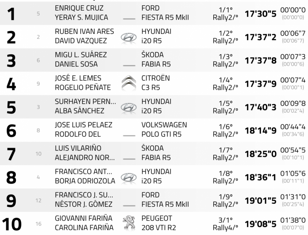 Los de Copi Sport empezaron siendo terceros, pero a sólo 0.4 de los gallegos Iván Ares y David Vázquez (Hyundai i20 R5) que empezaban mandando, pero en la segunda especial lograban ponerse líderes con sólo 0.7 por delante del palmero Miguel Ángel Suárez y el grancanario Daniel Sosa (Škoda Fabia R5), que habían sido segundos en la primera especial.