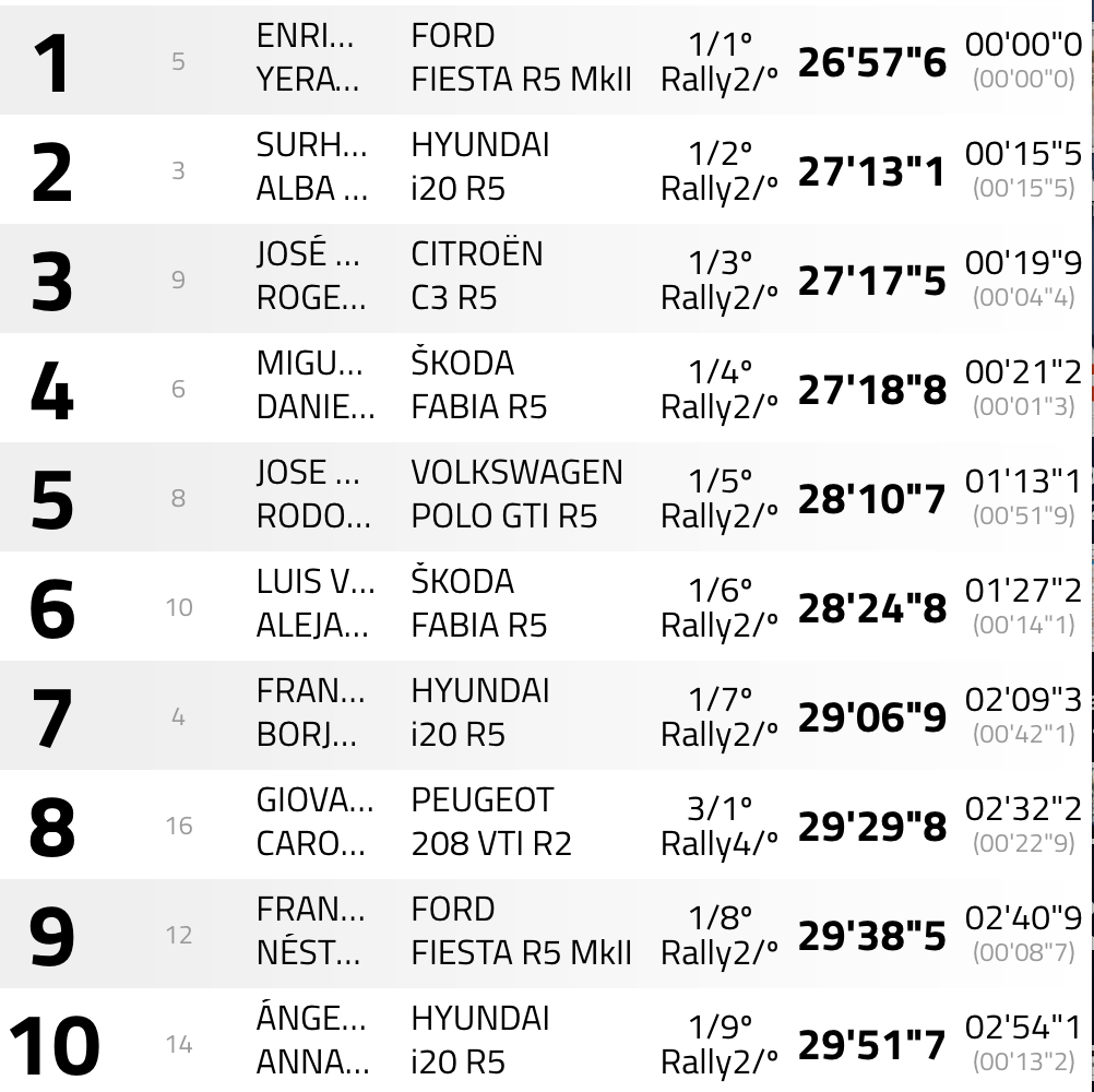 Mucho más lejos de los anteriores se sitúan José Luis Peláez y Rodolfo del Barrio (Volkswagen GTI R5), que son quintos a 1.13.1, seguidos de Luis Vilariño y Alejandro Noriega (Škoda Fabia R5), sextos, Francisco López y Borja Odriozola (Hyundai i20 R5), séptimos.