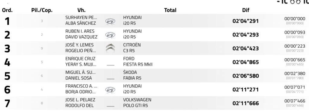 Los gallegos Iván Ares y David Vázquez (Hyundai i20 R5) han sido los segundos más rápidos con un 02’04″293, a sólo 0.093 de los mejores, siendo tercero y cuartos dos equipos canarios, los compuestos por Yeray Lemes y Rogelio Peñate (Citroën C3 R5), terceros a 0.223 de la cabeza, mientras que Enrique Cruz y Yeray Mujica (Ford Fiesta R5 MkII) han sido cuartos a 0.665, demostrándose que puede haber una bonita lucha por la victoria en la prueba tinerfeña.