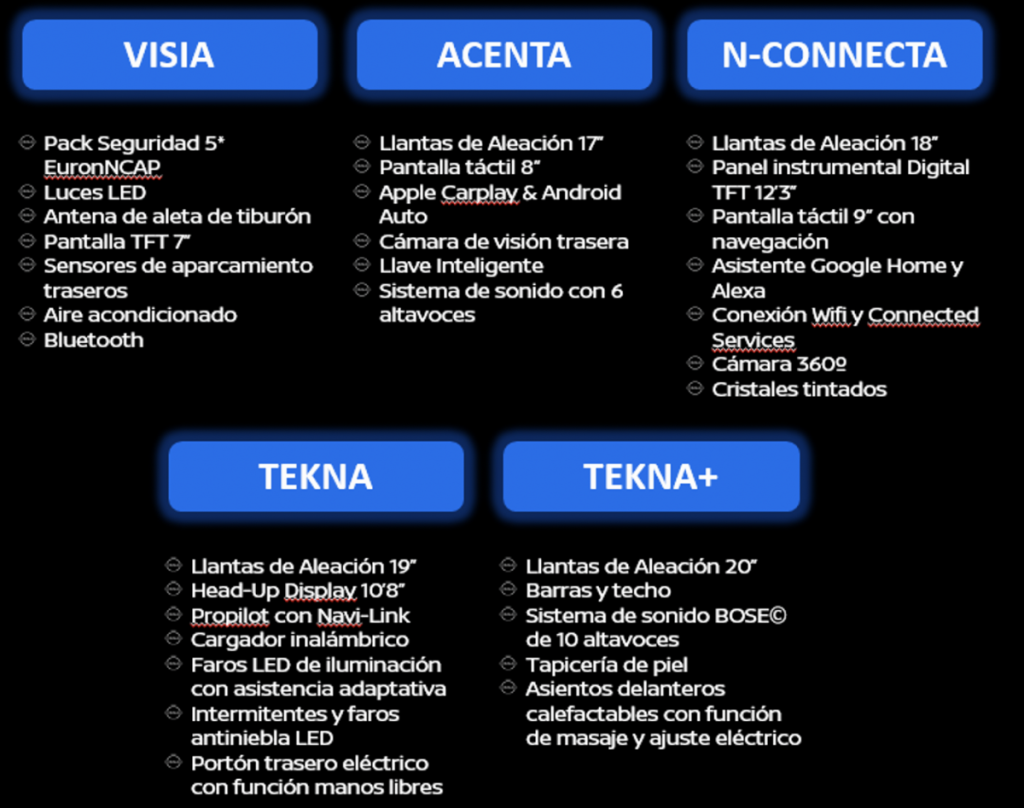 Habiendo escuchado a nuestros clientes, hemos concebido una gama fácilmente reconocible por sus nombres, ya que son los mismos de la generación anterior (Visia, Acenta, N-Conecta, Tekna y Tekna+) pero aportándoles más valor para que resulte todavía más atractiva a un número más amplio de clientes, ofreciendo más tecnología y más seguridad desde el primer nivel de acabado.