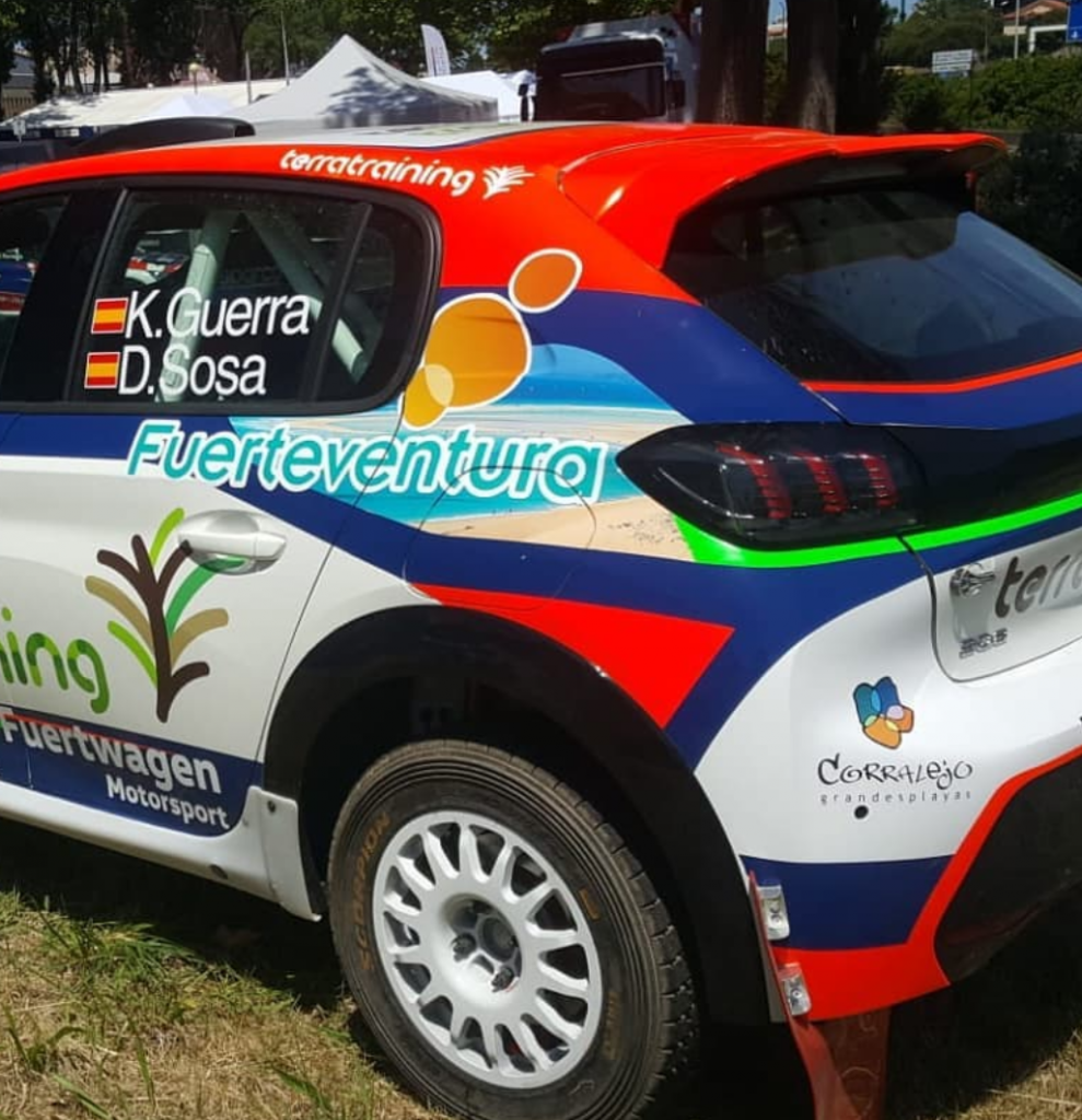 El piloto majorero Kevin Guerra, que junto al copiloto grancanario Dani Sosa correrá este fon de semana en el Rally de Portugal, cita del Campeonato del Mundo de Rallys y de la Peugeot Rally Cup Ibérica 2021, donde competirá la pareja canaria. Han aprovechado la cita del WRC para mostrar los colores que lucirá su Peugeot 208 Rally4.