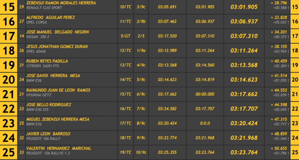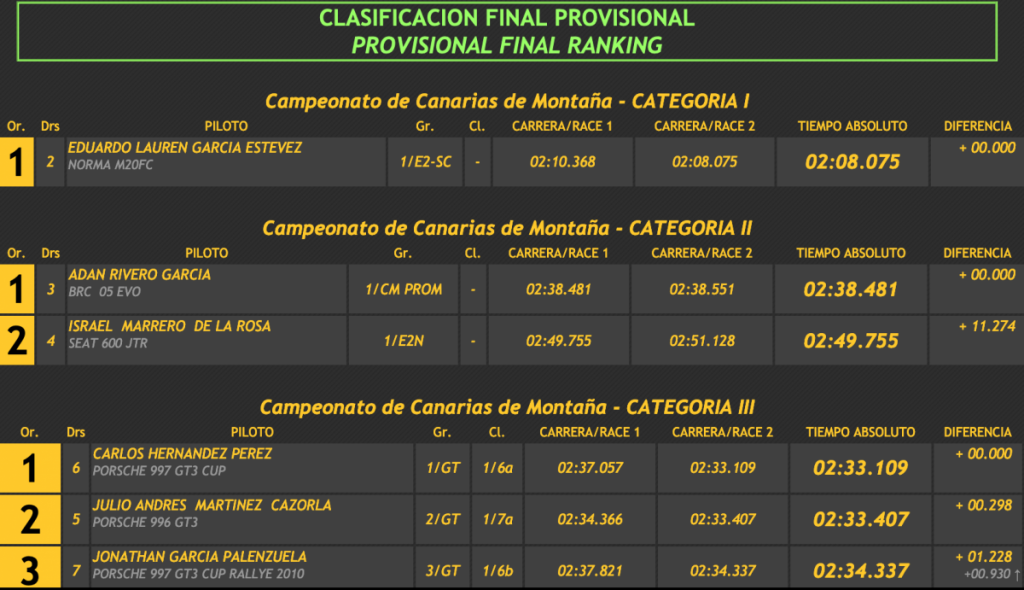 Lauren fue el más rápido de todo los particpantes con un 2:08.075, mientras que Carlos hacía un 2:33.109 para superar en sólo 00.298 al grancanario Julio Martínez (Porsche 996 GT3), siendo tercero Jonathan García Palenzuela (Porsche 997 GT3 Cup Rallye 2010),
