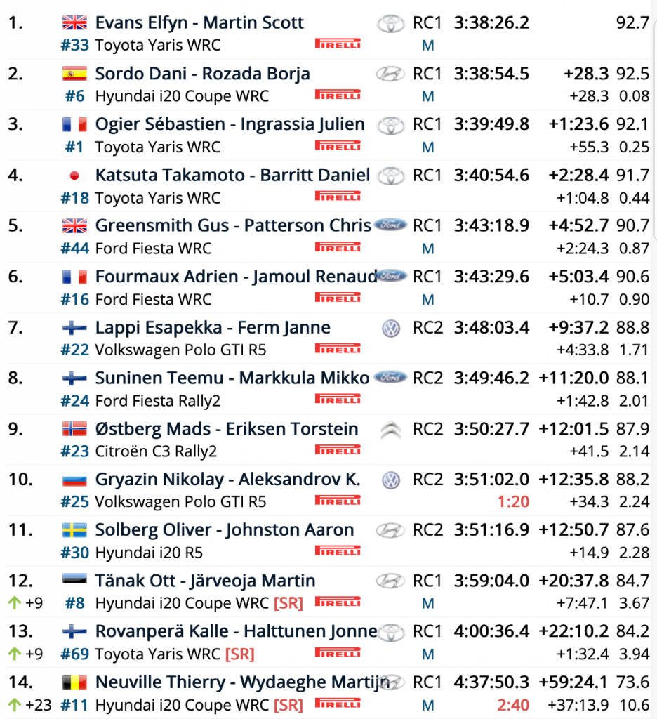Los británicos Elfyn Evans y Scott Martin (Toyota Yaris WRC) han logrado la victoria en el Rally de Portugal después de saber aprovechar de los problemas de los anteriores líderes, primero de los españoles Dani Sordo – Borja Rozada (Hyundai i20 Coupé WRC), que acabaron segundos, y después de sus compañeros de equipo en Hyundai Motorsport, los estonios Ott Tänak – Martin Järveoja (Hyundai i20 Coupé WRC).