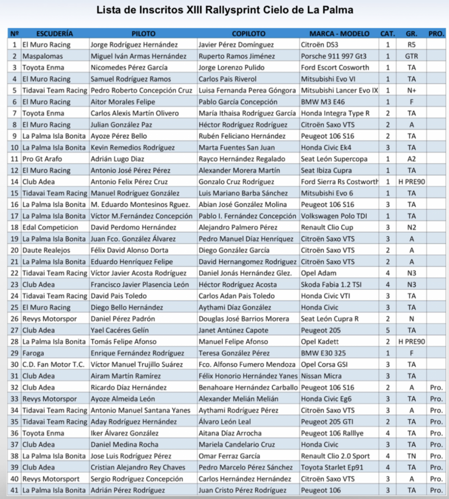 Se ha publicado la lista oficial de inscritos de esta prueba que inaugura el Campeonato de Canarias de Rallysprint. Jorge Rodríguez-Javier Pérez, con Citroën DS3 R5, encabezan la nómina de participantes de una cita que también será la segunda del provincial de S/C de Tenerife de la especialidad, además de ser puntuable para el certamen insular de la isla de La Palma.