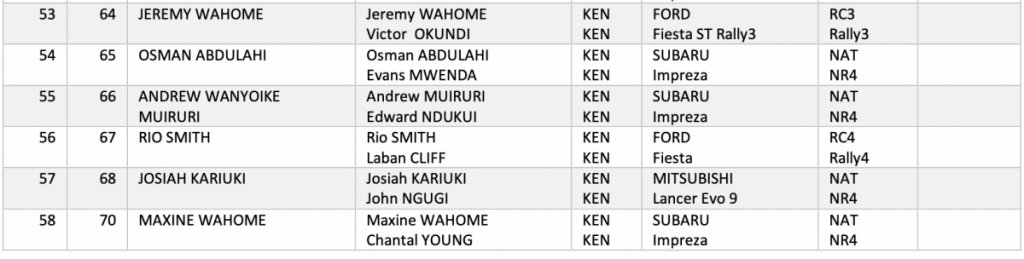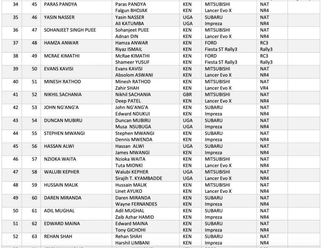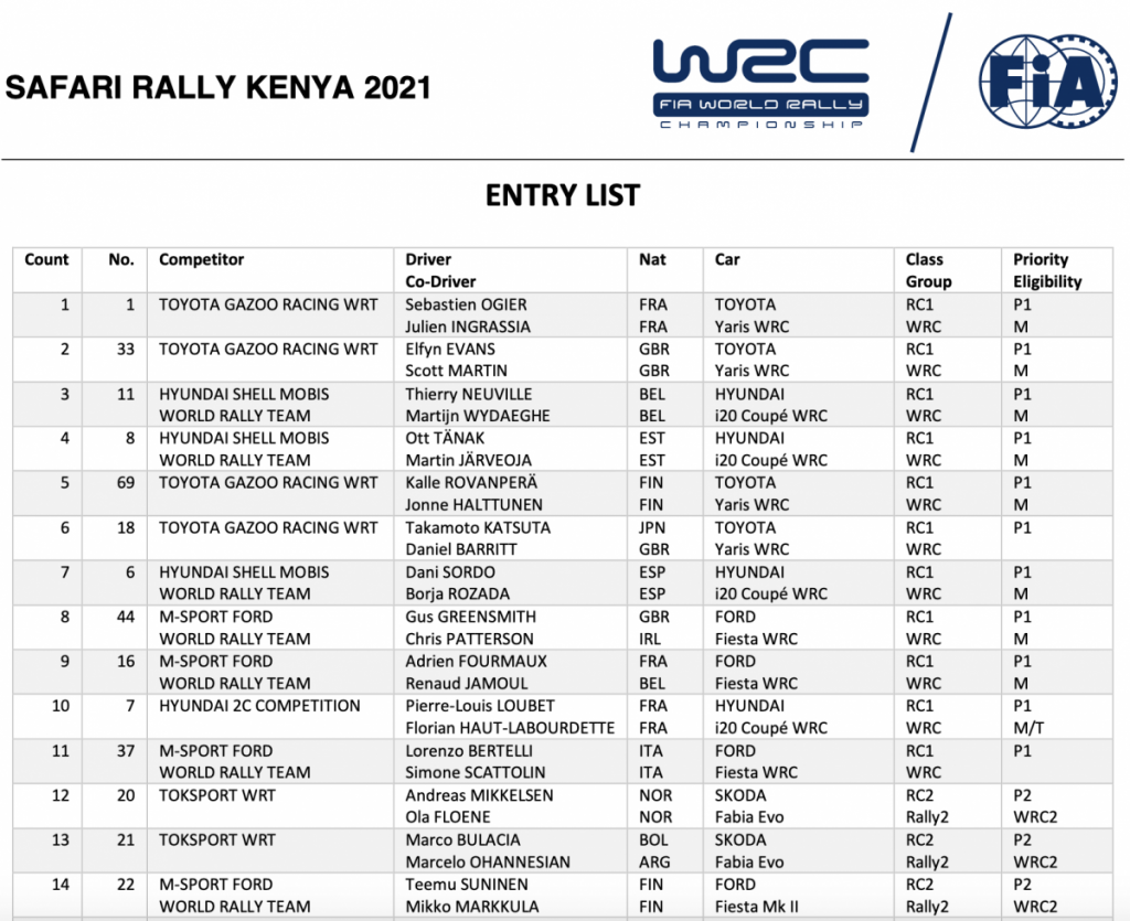 Un total de 58 equipos componen la lista de inscritos del Safari Rally Kenia 2021, cita del Campeonato del Mundo de Rallys.