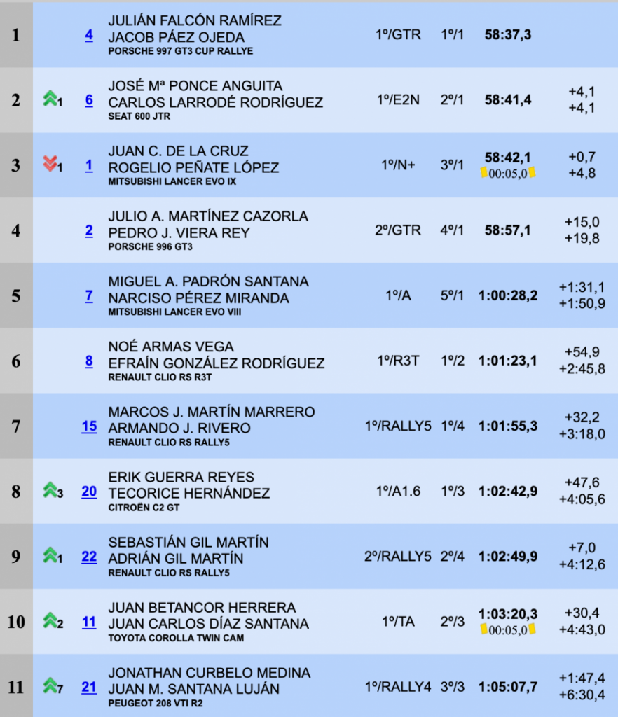 Si en la jornada del viernes eran los más rápidos, en el primer tramo del sábado todo cambió, con Juan Carlos de la Cruz-Rogelio Peñate (Mitsubishi Lancer Evo IX) y Ayoze Benítez-Patricia González (Mitsubishi Lancer Evo VII) por delante en el primer tramo, pero en el segundo todo cambió y Julián y Jacob comenzaron poco a poco a ampliar su renta hasta llevarla a más de 10 segundos respecto a Juan Carlos y Rogelio, que parecía que tenían la segunda plaza asegurada, pero nadie contó con el espectacular empuje final de José María Ponce-Carlos Larrodé (Seat 600 JTR), que de empezar sextos el viernes lograron remontar hasta la segunda plaza, a sólo 4.1 de la cabeza y superando en sólo 0.7 a de La Cruz y Peñate, terceros finales.