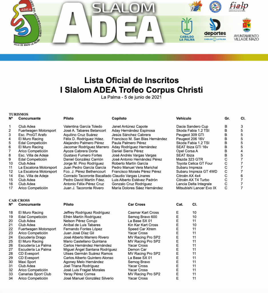 El Circuito Llanos del Calvario y el Club ADEA reactivan la actividad automovilística en la Villa de Mazo con el I Slalom ADEA Trofeo Corpus Christi. La prueba inaugural del regional de la especialidad ha reunido a más de 30 equipos, prácticamente la mitad en Turismos y la otra mitad en Car Cross.