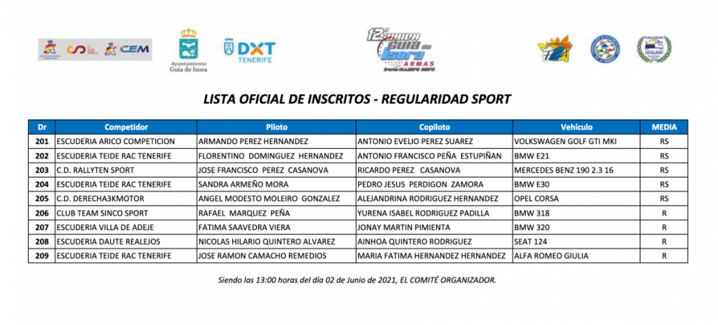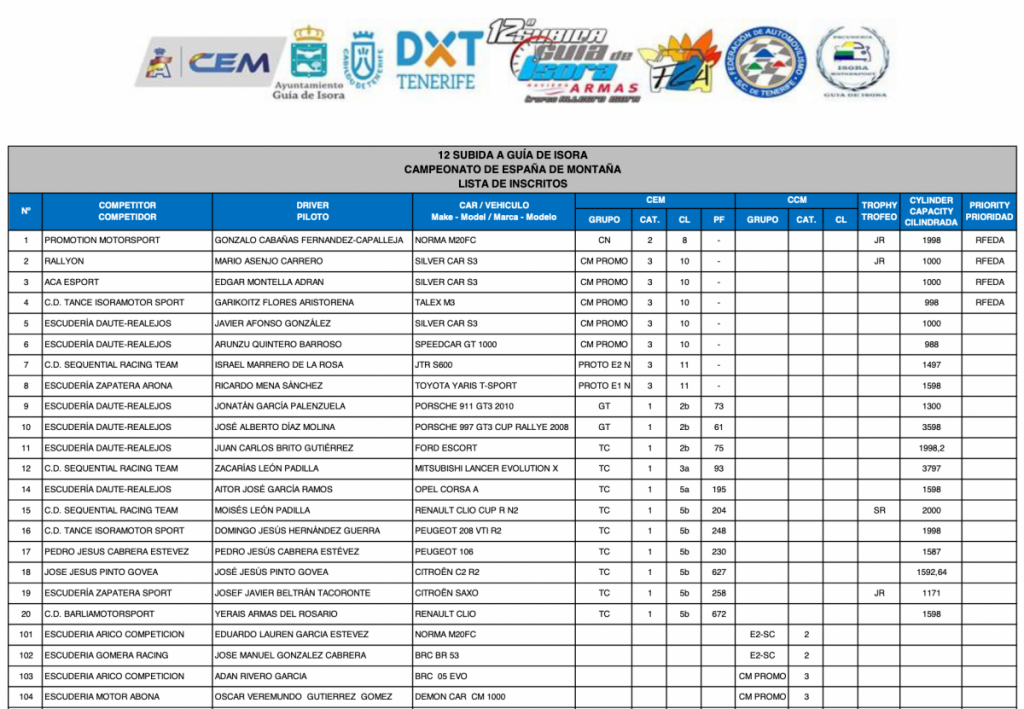 La 12ª Subida Guía de Isora Naviera Armas Trofeo Allegro Isora se acerca a las horas previas al arranque de los motores, conociéndose este miércoles la lista oficial de inscritos. Con más de 60 equipos, destaca la participación de 12 monoplazas, 5 GTs, así como 9 equipos en la modalidad de Regularidad.