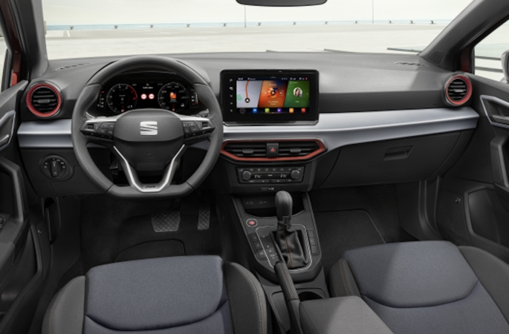 En cuanto al habitáculo, el nuevo Ibiza da un gran salto cualitativo con un salpicadero de nuevo diseño y textura blanda que sitúa la pantalla flotante, ahora con tamaños más grandes, en una posición más alta y segura ya que permite no apartar la mirada de la carretera. Asimismo, mejora la calidad también en los guarnecidos de las puertas y en la tapicería de los asientos, que también renuevan sus diseños, y el tapizado del volante multifunción está forrado en Nappa, aportando un tacto de más confortable –desde el acabado Style en opción, y de serie en los Xcellence y FR–.