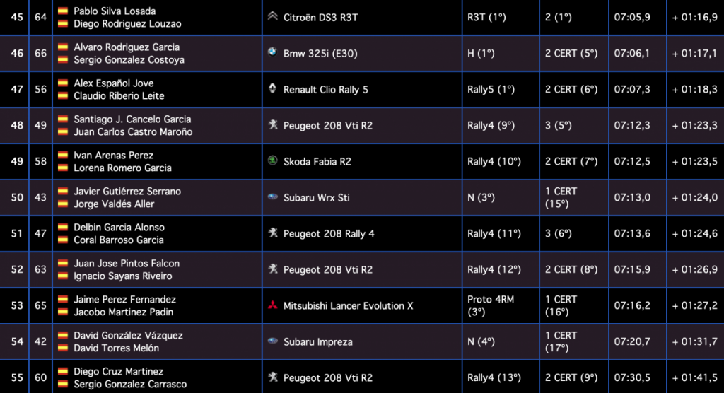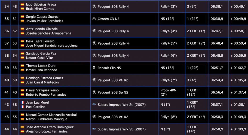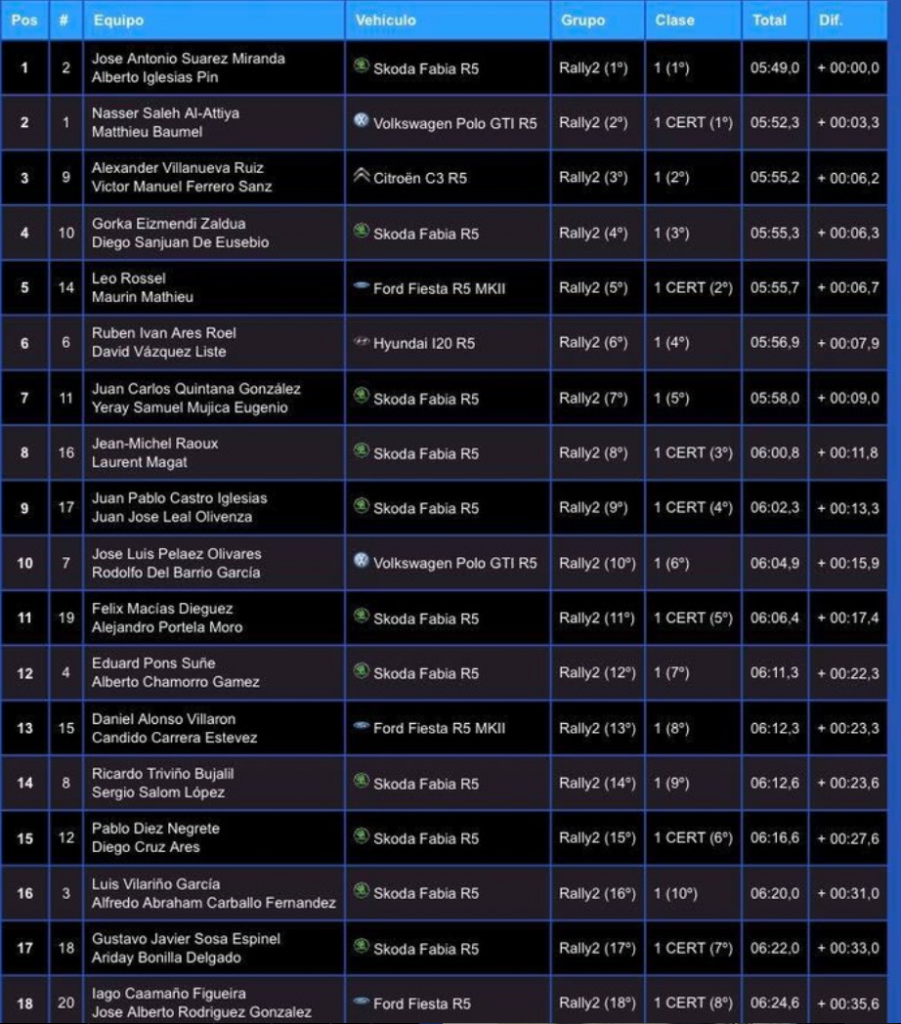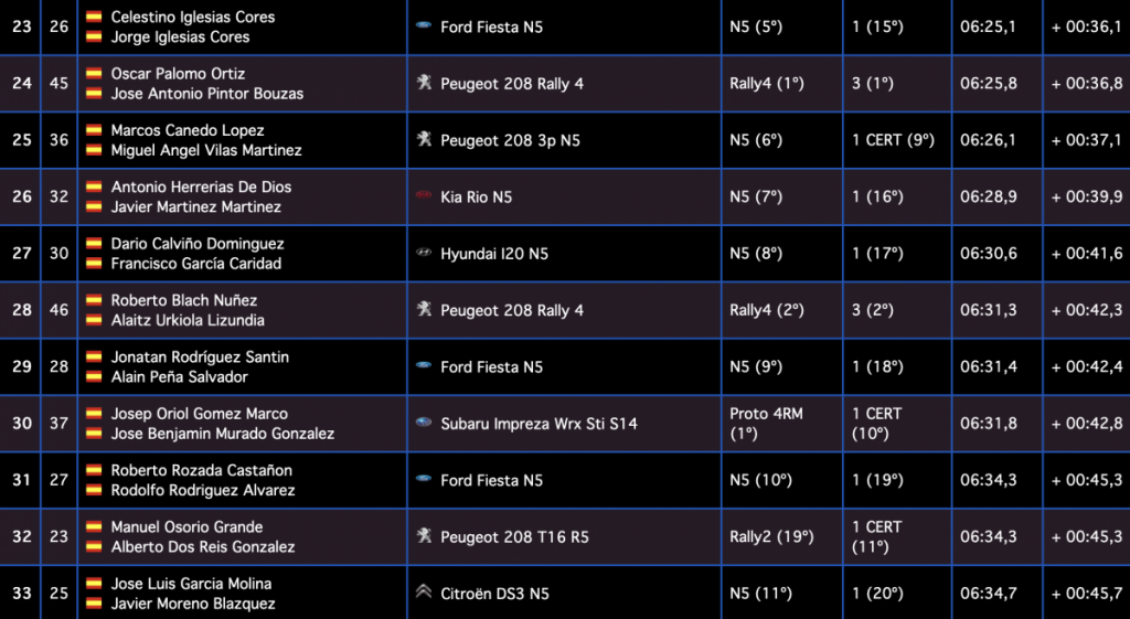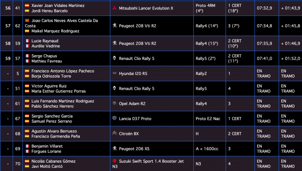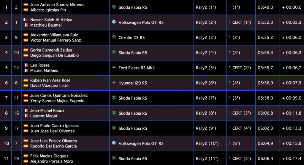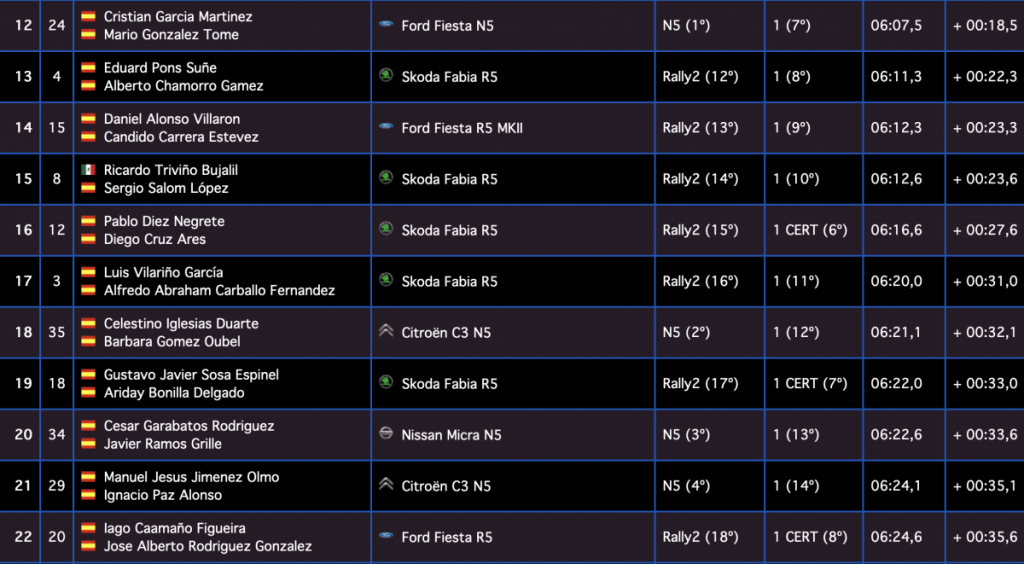 Los gallegos Iván Ares y David Vázquez (Hyundai I20 R5) son sextos, a 7.9, seguidos de los canarios Juan Carlos Quintana y Yeray Mujica (Skoda Fabia R5), séptimos, a 9.0, siendo octavos los galos Jean-Michel Raoux y Laurent Magat (Skoda Fabia R5), a 11.8.