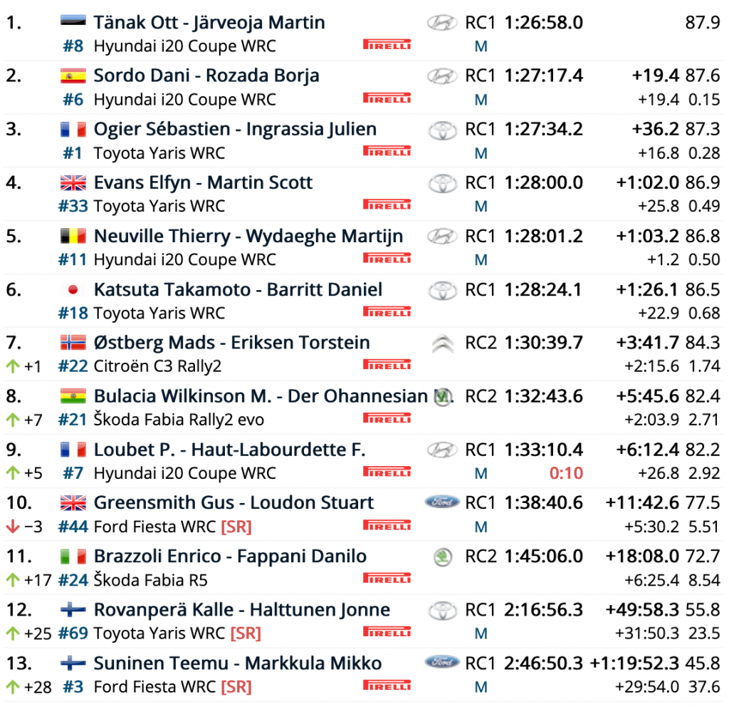 En el bucle de la mañana Tänak y Järveoja se llevaron los cuatro mejores tiempos, lo que les valió para superar a Sordo y Rozada en 16.9. En la primera especial del bucle de la tarde también fueron los más rápidos, aunque la novedad estaba en que los galos Sébastien Ogier y Julien Ingrassia (Toyota Yaris WRC), que eran terceros, a sólo 1.8 de la segunda plaza, le arrebataban este puesto a los españoles.