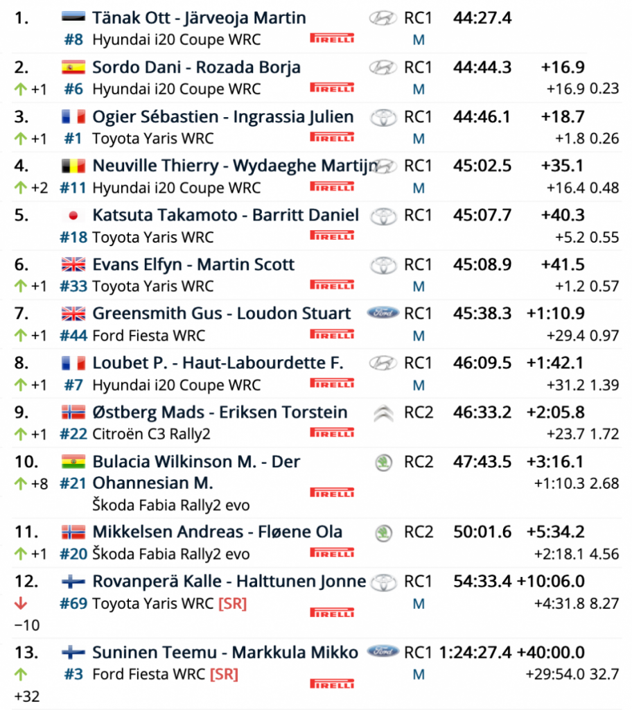 Tänak y Järveoja no han dejado lugar a la sorpresa al superar a todos sus rivales en las especiales matinales y tras más de 72 kilómetros contra el crono, logrando aventajar a sus compañeros de equipo, los españoles Dani Sordo y Borja Rozada (Hyundai i20 Coupe WRC), en 16.9, siendo terceros los galos Sébastien Ogier y Julien Ingrassia (Toyota Yaris WRC), a 18.7 y a sólo 1.8 de la segunda plaza.