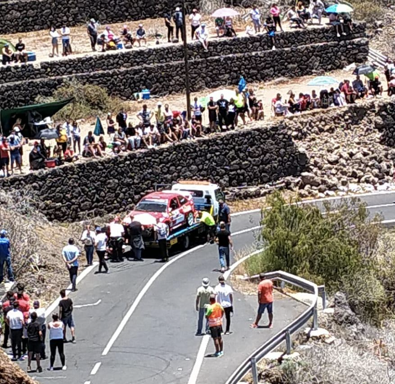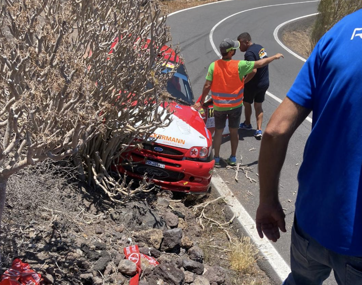 Mala suerte para el piloto tinerfeño Juan Carlos Brito, que después de ser el más rápido en las dos mangas de entrenamiento de la Subida Guía de Isora, se ha salido con su Ford Escort WRC en la primera oficial, no pudiendo terminarla. Lo más importante, sin daños para el piloto del norte de Tenerife.