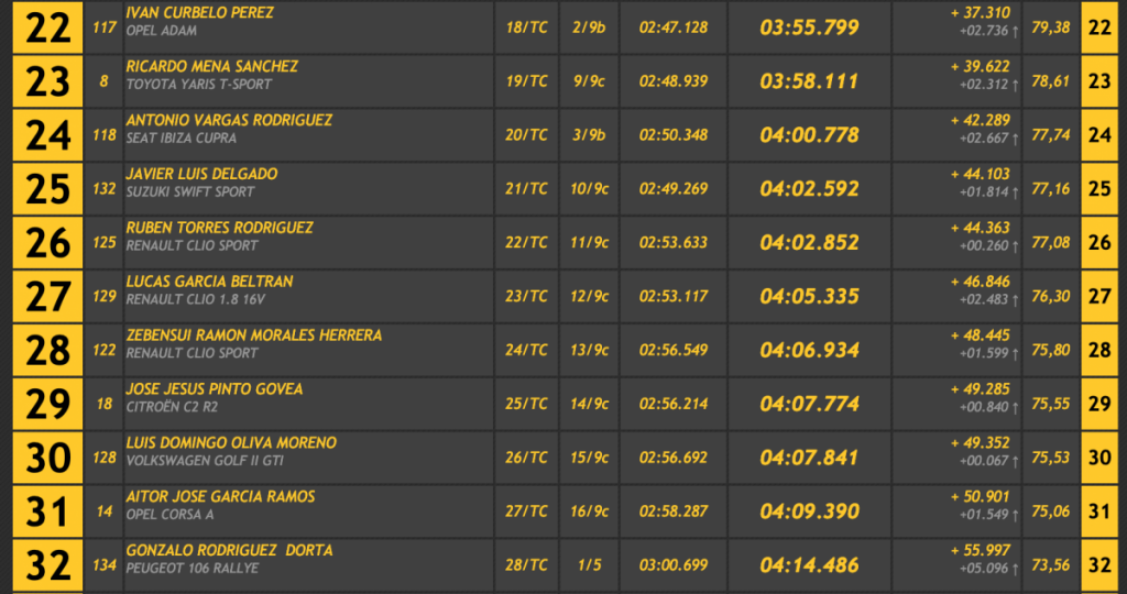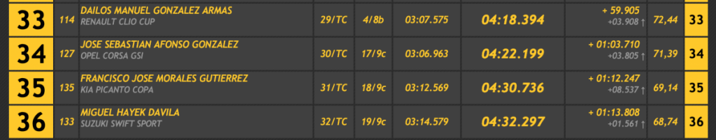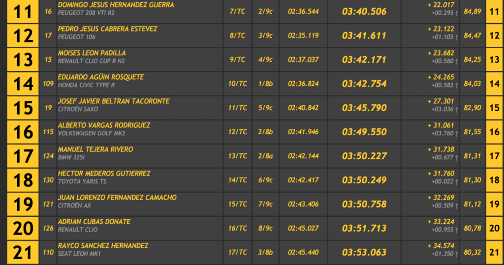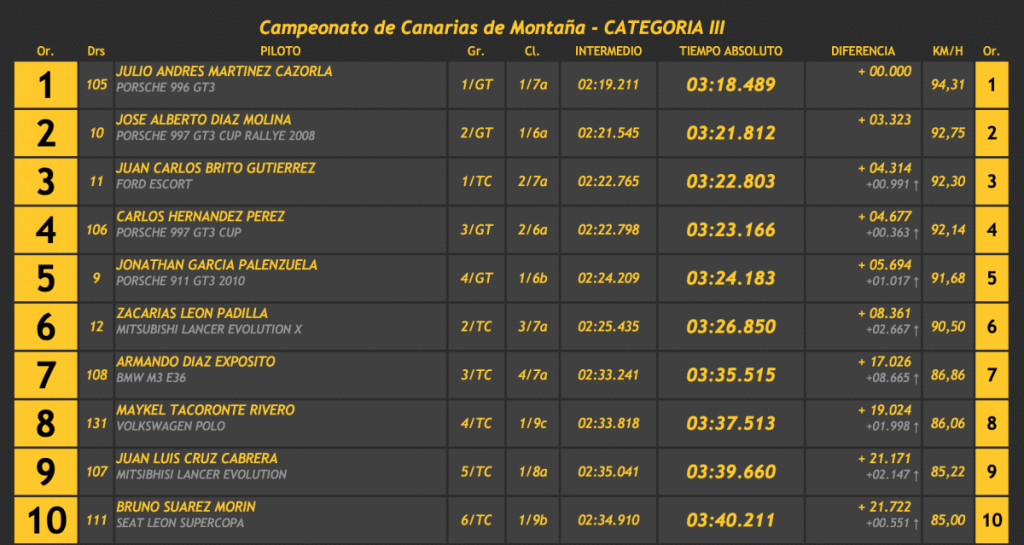 En turismos Martínez fue el único en baja del 2:20, superando en 3.323 a Berti Díaz (Porsche 911 GT3 Cup Rallye 2008), segundo, en 4.314 Juan Carlos Brito (Ford Escort WRC), que pudo realizar la última manga tras su salida de carretera en la primera, en 4.677 a Carlos Hernández (Porsche 911 GT3 Cup), y en 5.694 a Jonathan García Palenzuela (Porsche 911 GT3 2010).