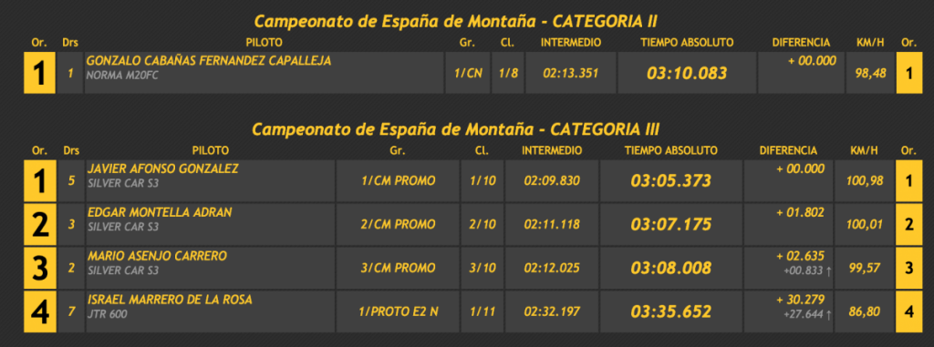 El tinerfeño Lauren García (Norma M20FC), en la categoría I, con récord incluido, su paisano Javi Afonso (Silver Car S3) en la categoría II, y el grancanario Julio Martínez (Porsche 996 GT3), ha sido los dominadores de la primera jornada de la Subida Guía de Isora, cita del Campeonato de España, Canarias y Tenerife de Montaña 2021.