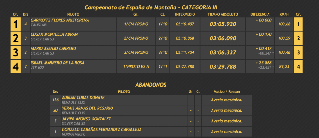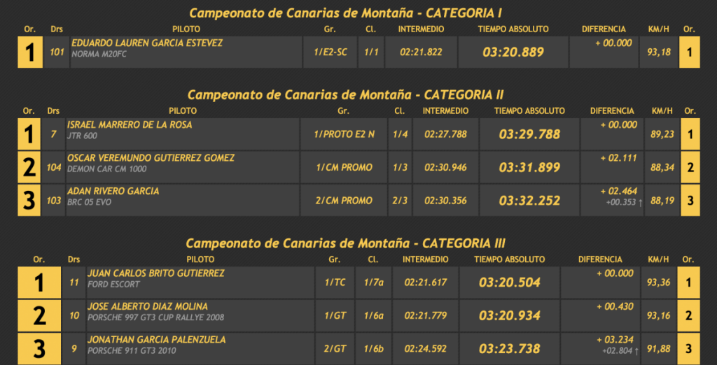 La segunda jornada de la Subida Guía de Isora, cita del Campeonato de España, Canarias y Tenerife de Montaña 2021, tuvo nuevamente al tinerfeño Lauren García (Norma M20FC) como gran dominador de la categoría I, con Garikoitz Flores (Talex M3) como ganador de la categoría III, y el también local Juan Carlos Brito (Ford Escort WRC), entre los turismos, ha sido los dominadores de la segunda y última jornada de la cita tinerfeña.