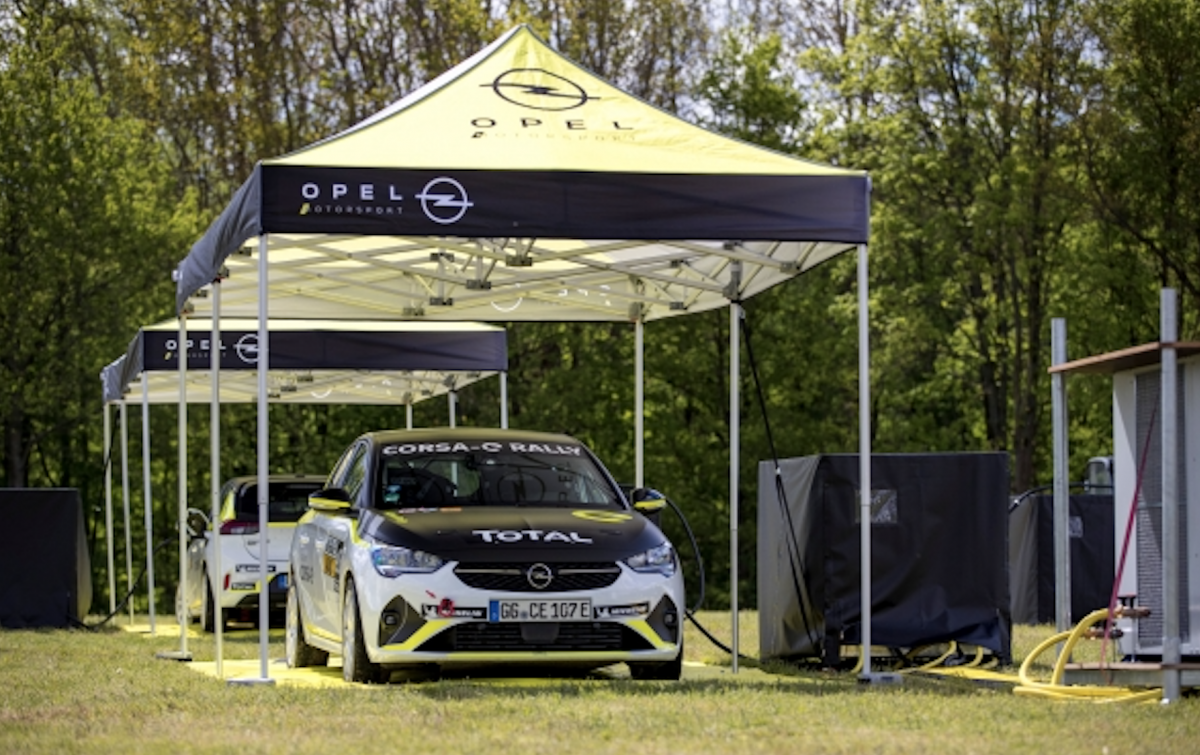 La infraestructura de carga para la ADAC Opel e Rally Cup, que se ha desarrollado junto a Opel Motorsport, emplea electricidad renovable de la red eléctrica pública. La corriente media extraída se introduce en un transformador especialmente adaptado para su uso en los rallies (“Fuente de Corriente Continua”), el llamado “Power House”. Esto evita la memoria caché y suministra una potencia máxima de 2,0 megavatios a 18 puntos de carga, que se habilitan en la carpa de asistencia de cada coche de la copa. Cada punto de carga alimenta al vehículo con hasta 140 kilovatios (kW), con lo que el Opel Corsa-e Rally puede cargar a un máximo de 100 kW de corriente continua (CC). La batería de 50 kilovatios-hora (kWh) del coche preparado para los rallies se puede cargar hasta el 80% de su nivel máximo en unos 30 minutos. Incluso durante una asistencia más corta la carga para poder afrontar las siguientes especiales no plantea ningún problema.