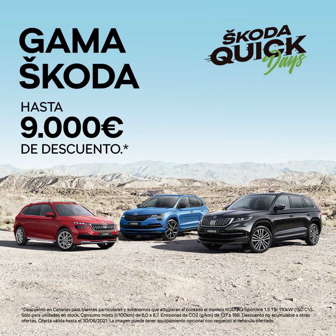A pocos días de la llegada del verano, ŠKODA Canarias invita a los canarios a adelantarse a la temporada estival con los descuentos de la marca verde. Así, con los Quick Days, ŠKODA Canarias vuelve a ofrecer la oportunidad a todos los clientes canarios para que puedan hacerse con ese ŠKODA con el que siempre soñaron a un precio impactante.